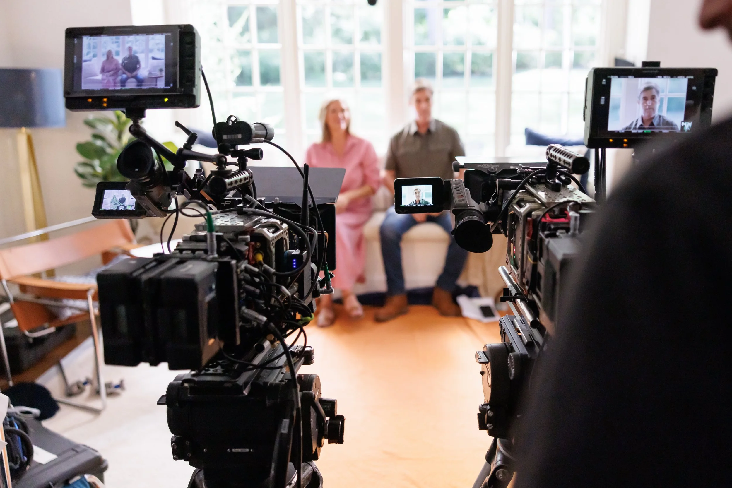 Film crew setting up cameras and equipment to film a scene with two people sitting on a sofa in a bright room with large windows.