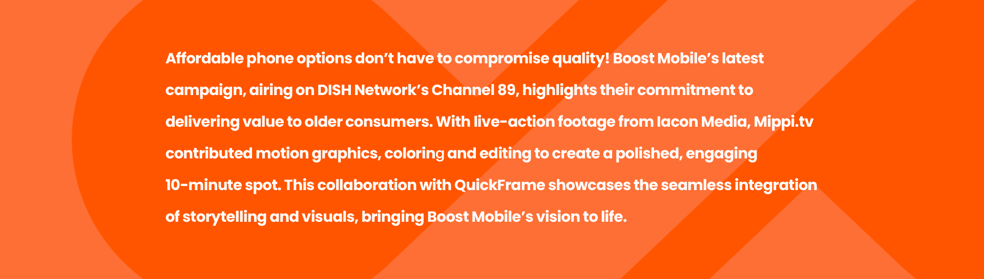 A graphic with orange backgrounds and white text about a campaign for budget-friendly phones on DISH Network and Mippi.tv featuring live-action footage, graphics, and storytelling.