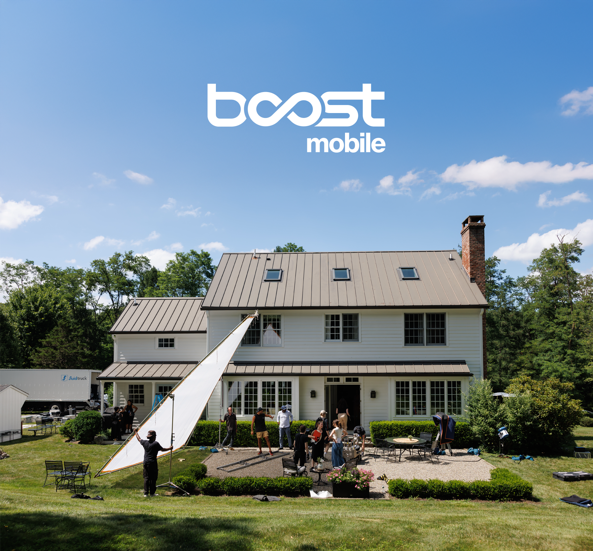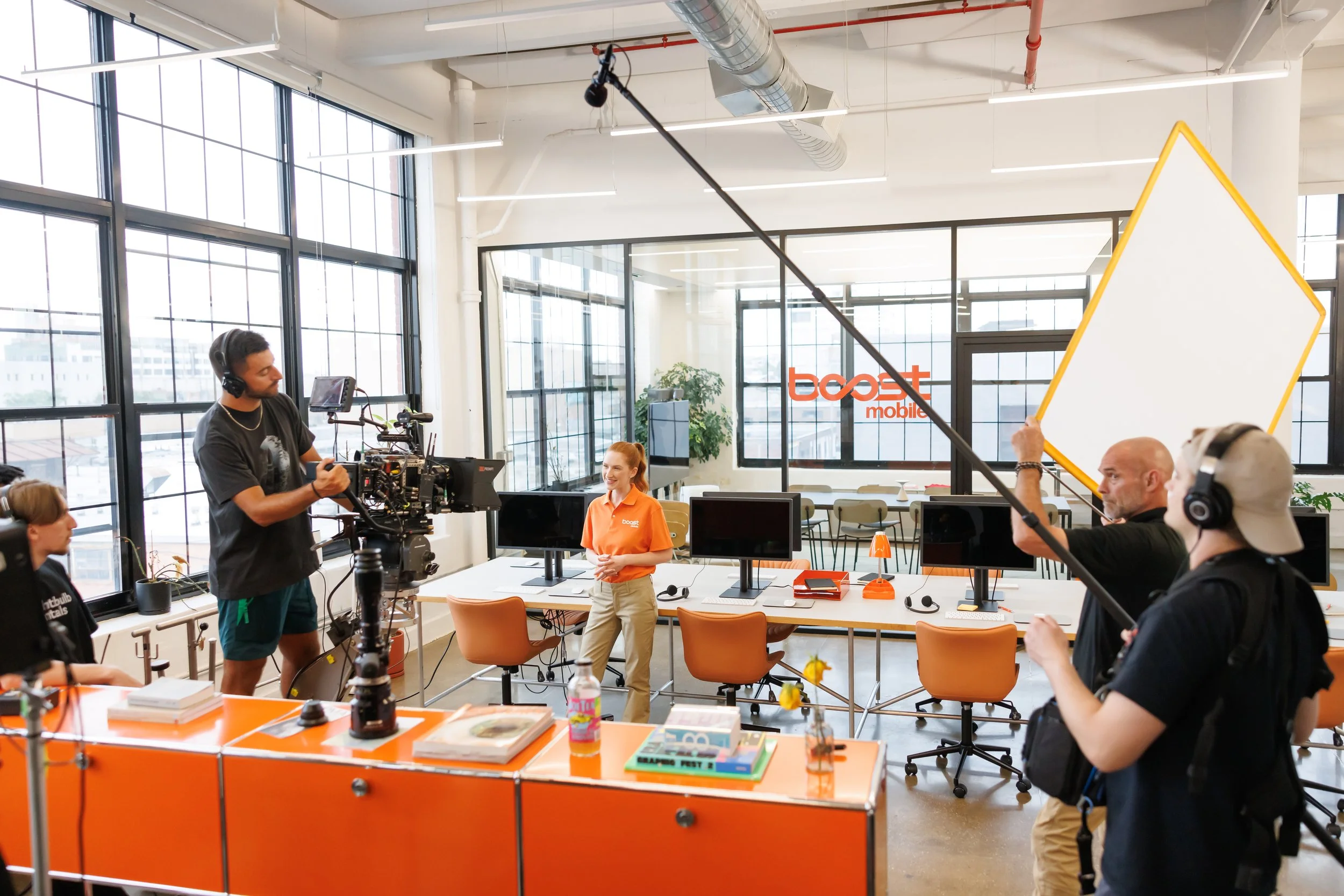 A woman in an orange shirt being filmed during a studio shoot in a modern office space with large windows and a 'boost mobile' sign in the background.