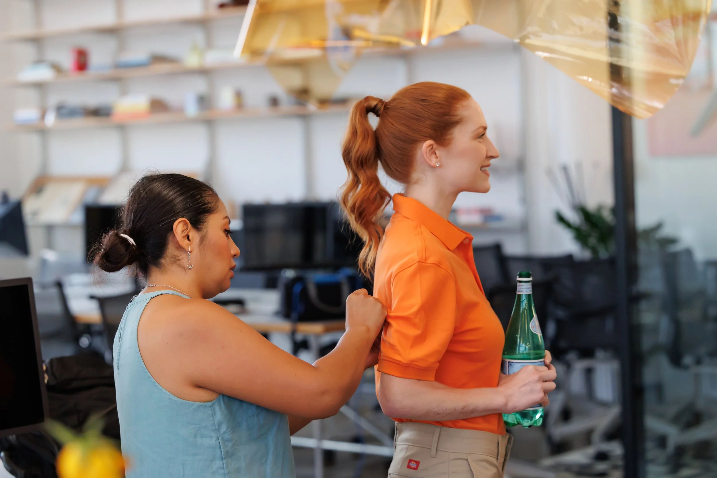 A woman in an orange shirt and beige pants is standing in an office, smiling, and holding a green glass bottle of water. Another woman with dark hair tied back is behind her, adjusting her shirt. The office has shelves with books and various items, and the environment appears casual and lively.