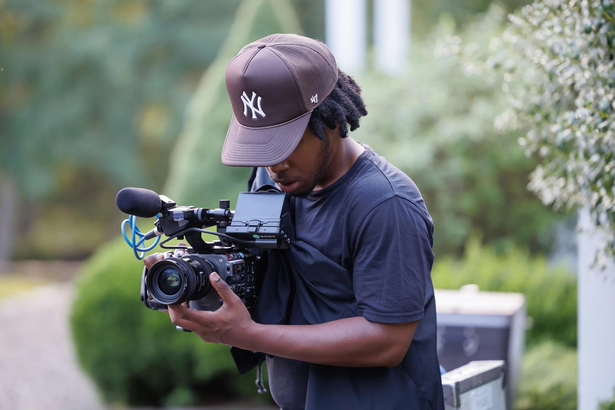 A man wearing a baseball cap and black T-shirt holding a professional video camera outdoors in a park.
