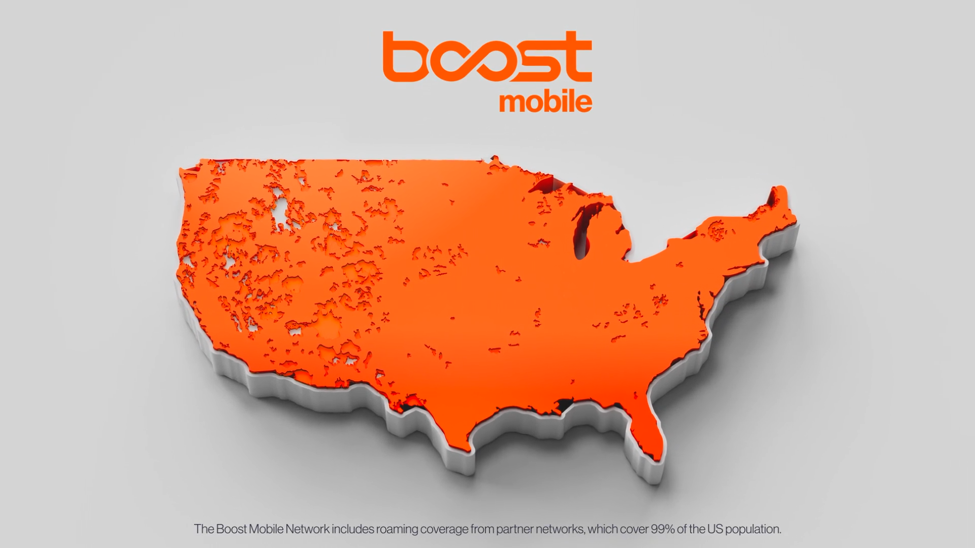 3D map of the United States in orange with Boost Mobile logo above it. Text below states Boost Mobile Network includes roaming coverage for 99% of the U.S. population.