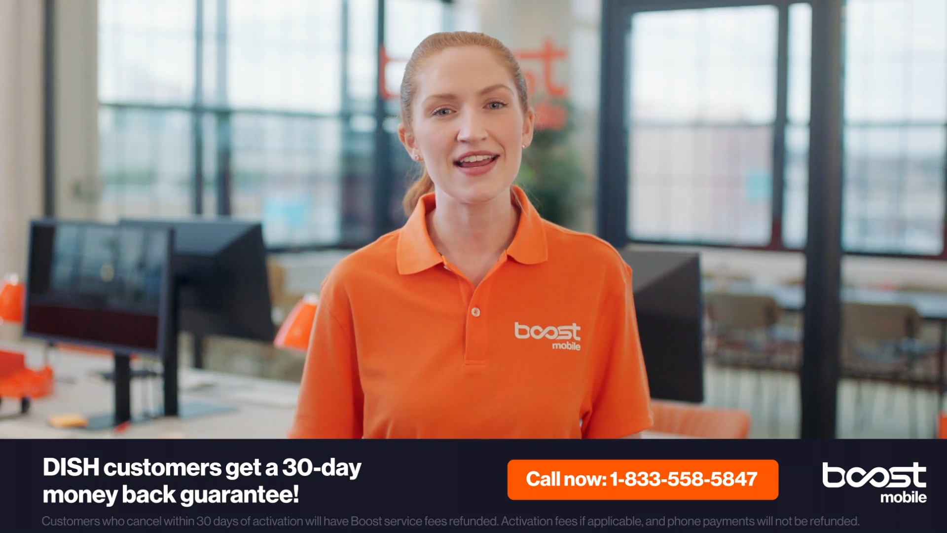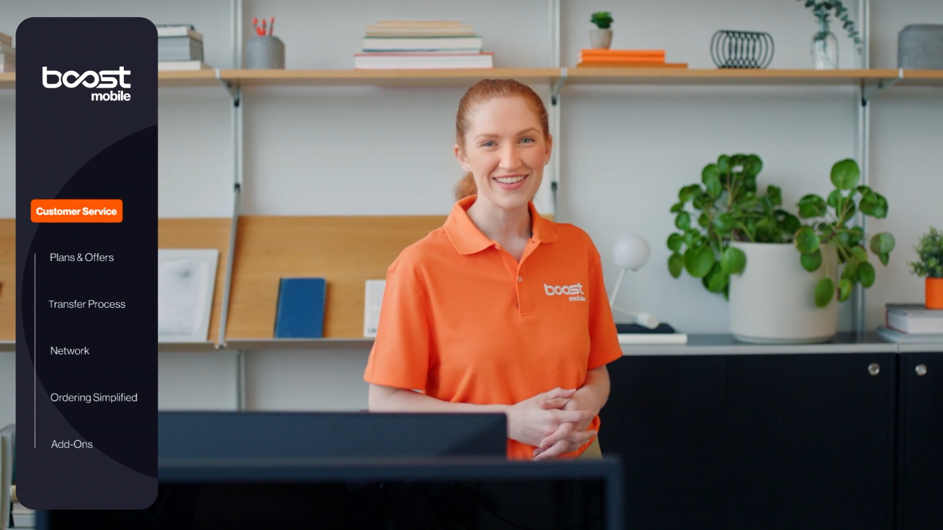 A smiling woman with red hair, dressed in an orange Boost Mobile uniform, stands in an office setting with shelves and plants in the background. UI/UX on the left.