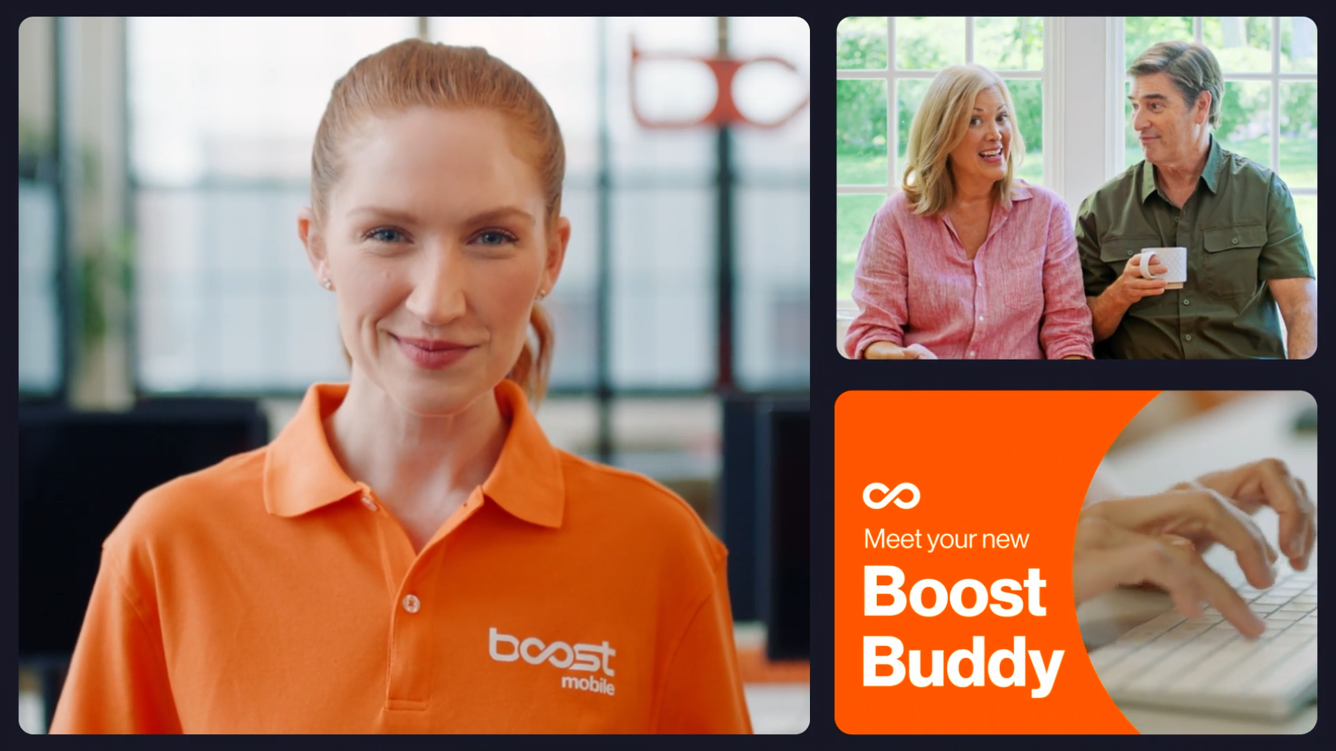 A Boost Mobile employee with red hair in an orange polo shirt smiling, two people having a conversation in a bright room with large windows, and a hand typing on a laptop. Overlay text states 'Meet your new Boost Buddy'.