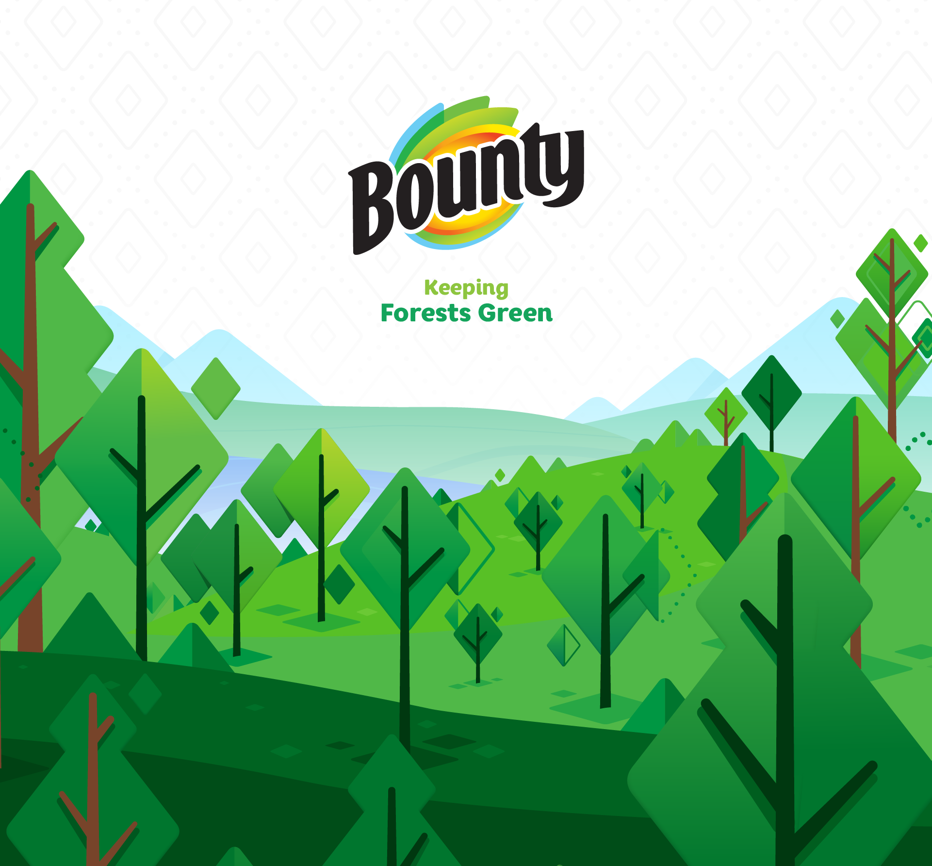 Illustration of a forest with various green trees, mountains in the background, and the text 'Bounty Keeping Forests Green'. Bounty Logo.