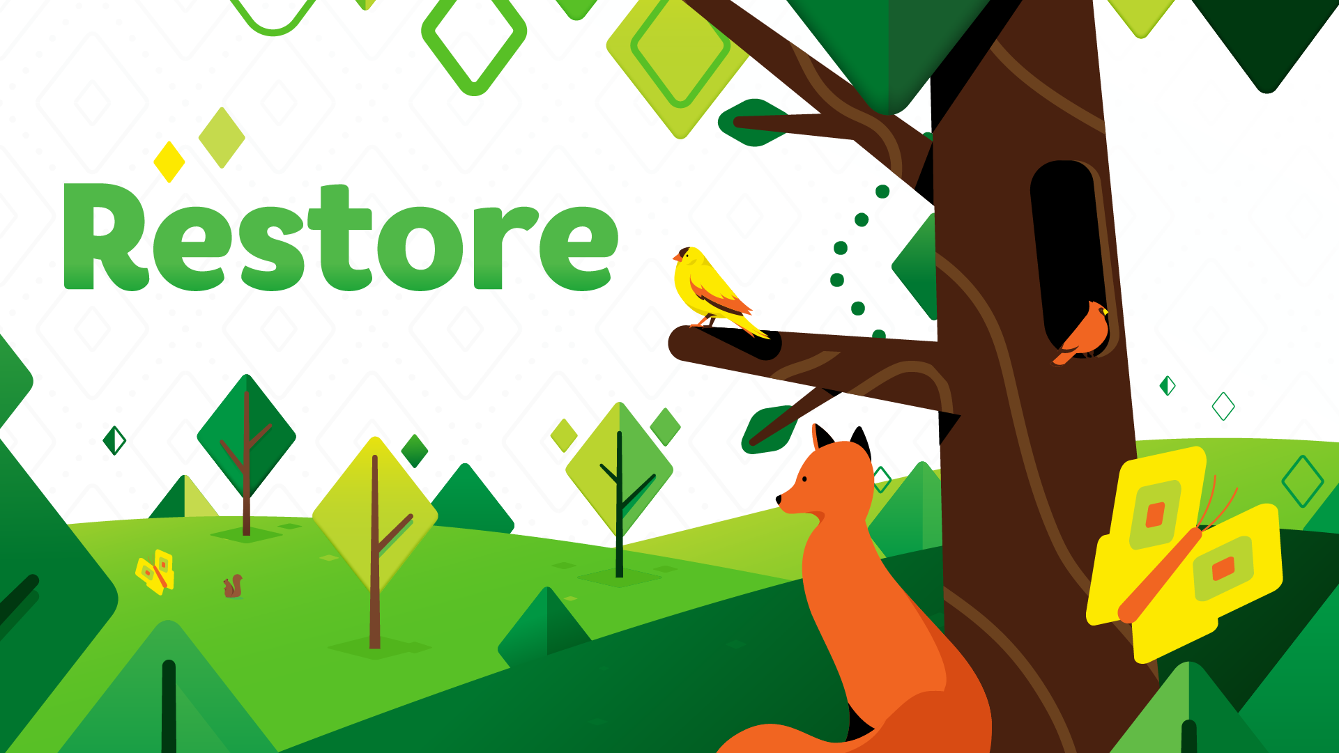 Illustration of a tree with the word 'Restore' on it, surrounded by birds, a fox, a butterfly, a squirrel, and other greenery.