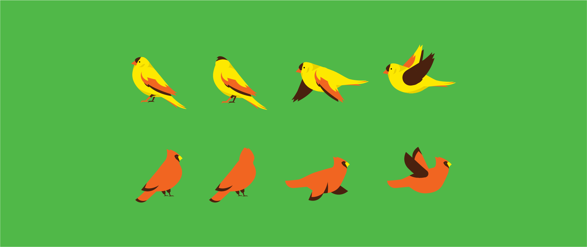 Eight stylized illustrated, colorful birds on a green background, with four yellow canaries in the top row and four cardinal birds in the bottom row.