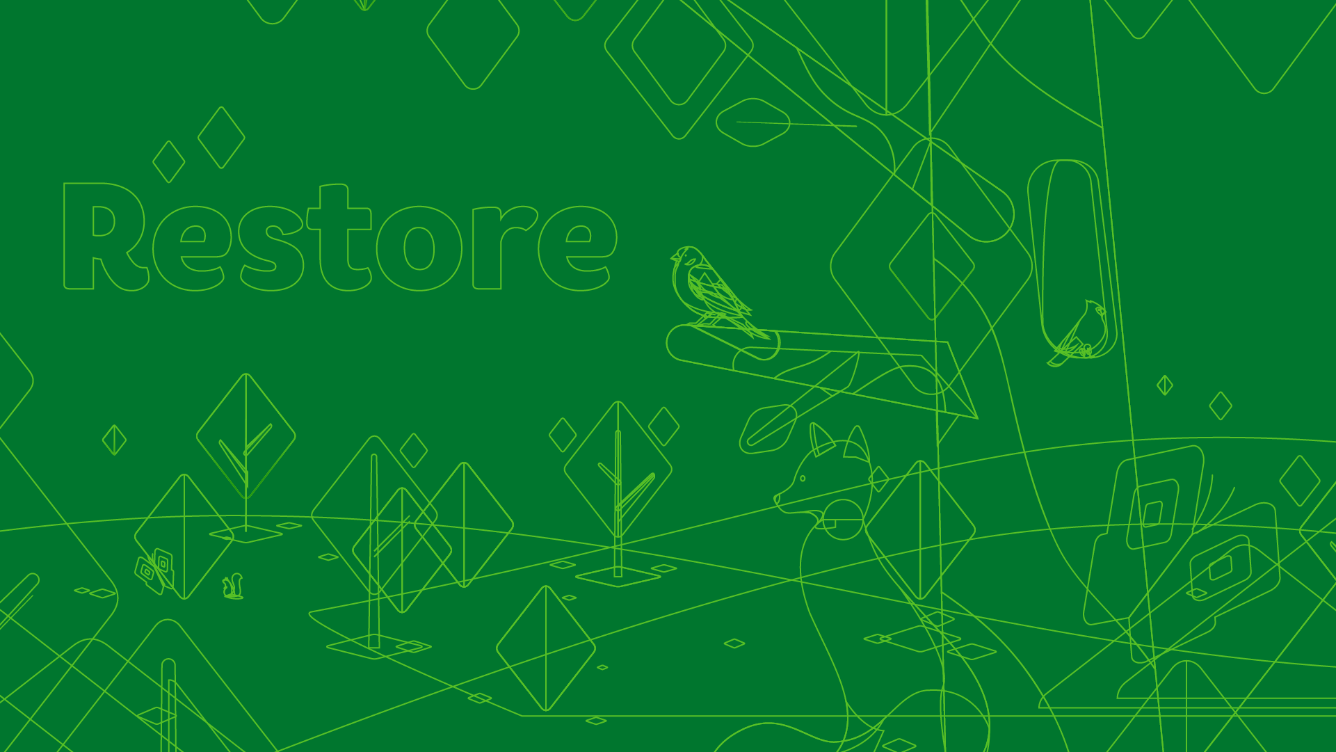 Green digital graphic with the word 'Restore' and line art images of a bird and a fox on branches, surrounded by geometric shapes and abstract elements.