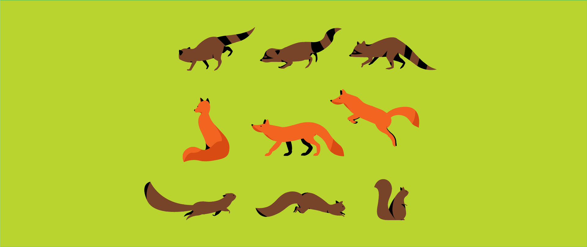 Illustration of various animals on a green background, including raccoons, foxes, and squirrels.