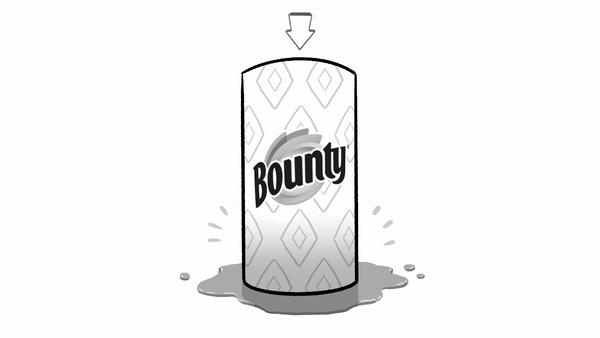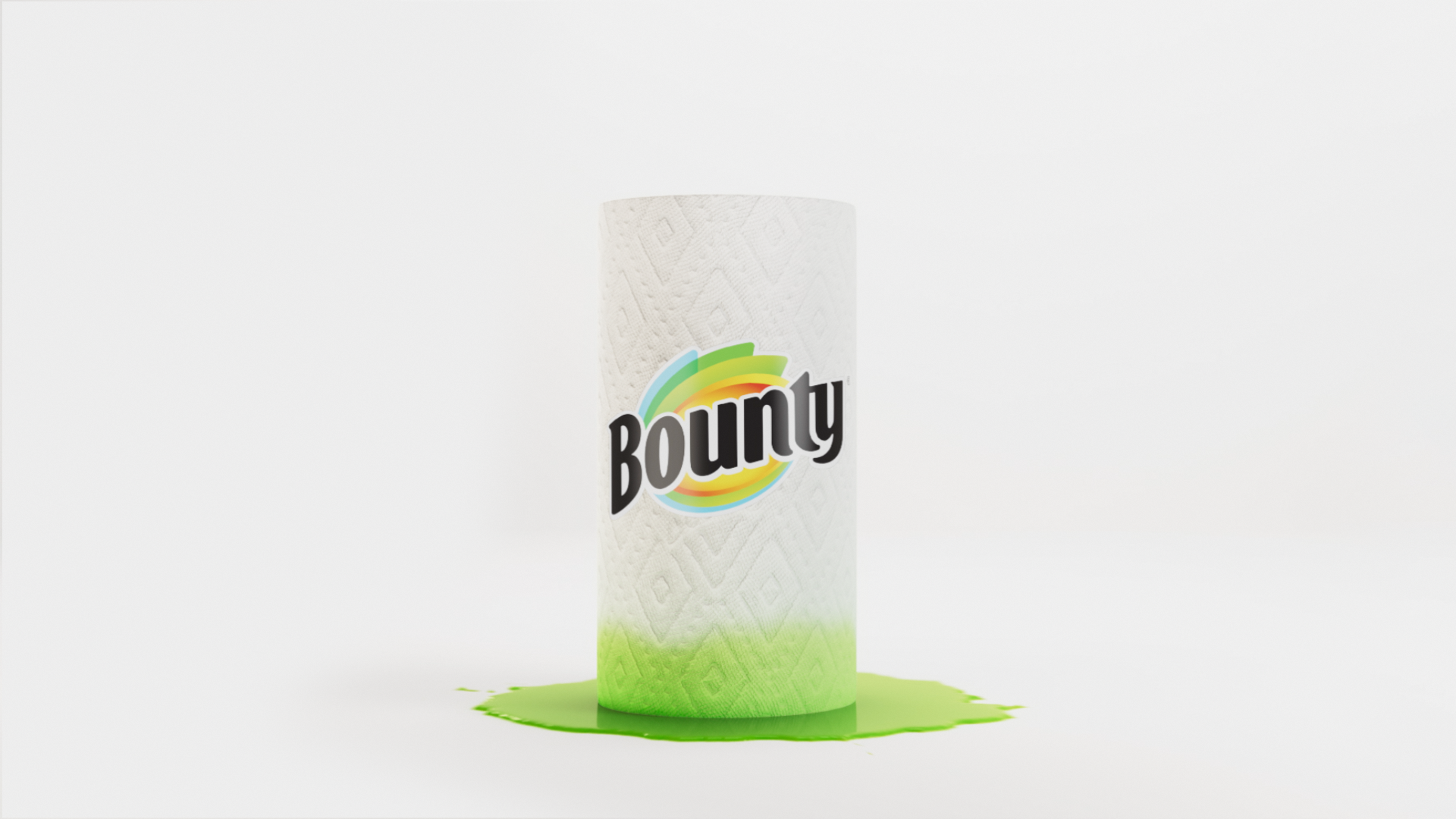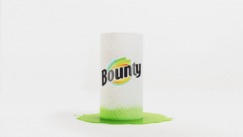 An animated gif roll of Bounty paper towels standing upright on a white surface, with some green liquid spilled underneath.