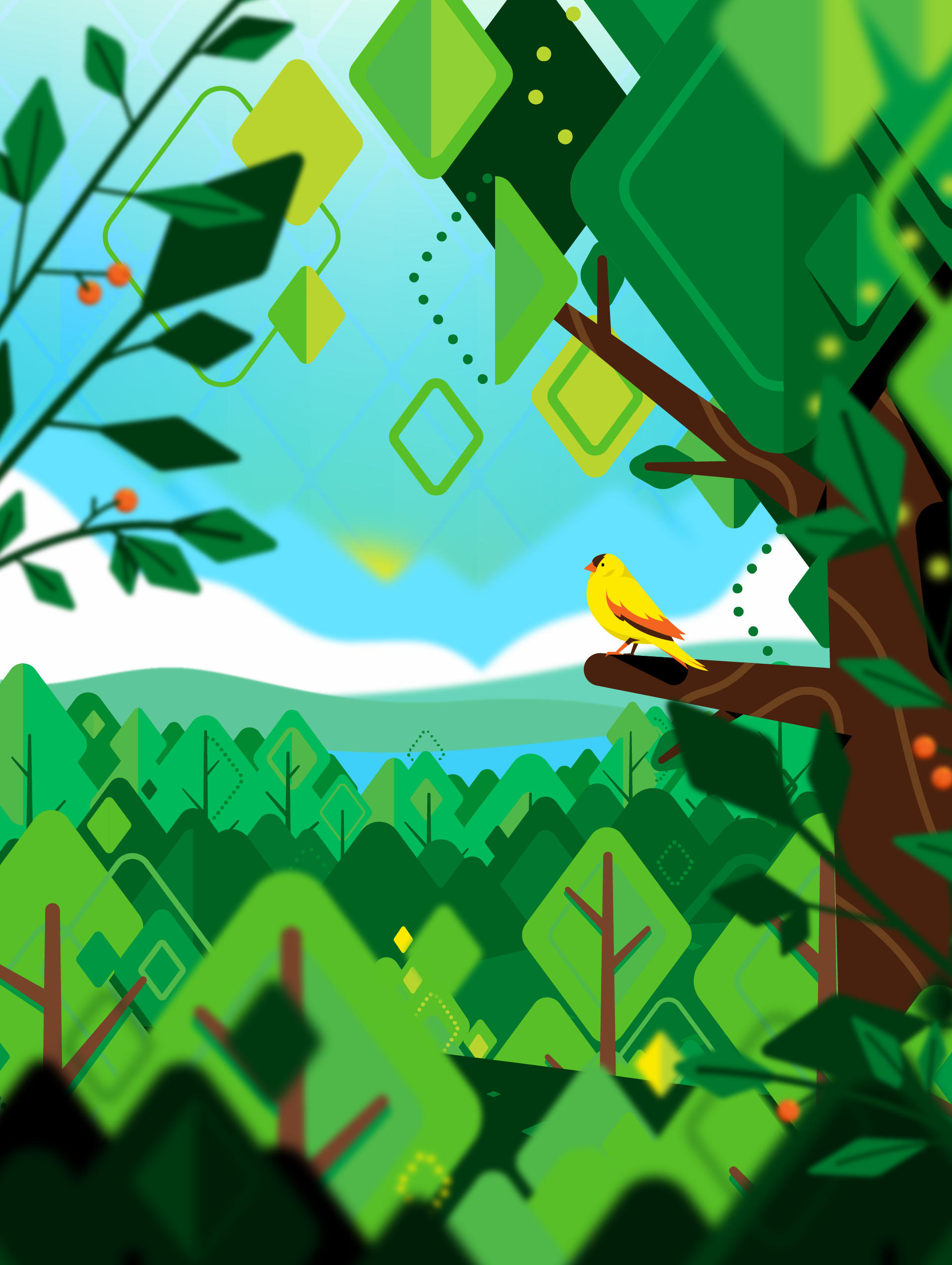 Stylized digital illustration of a yellow bird perched on a tree branch in a lush green forest, with a blue sky, distant hills, and a river in the background.