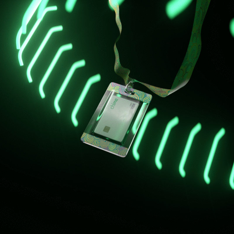 A 3D gif of a lanyard with a clear badge holder displaying a card with 'Chime' and a Visa logo, hanging against a backdrop of green neon lights.