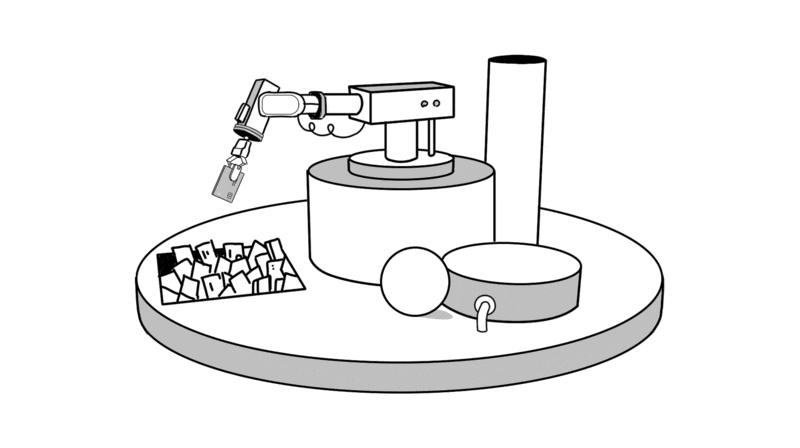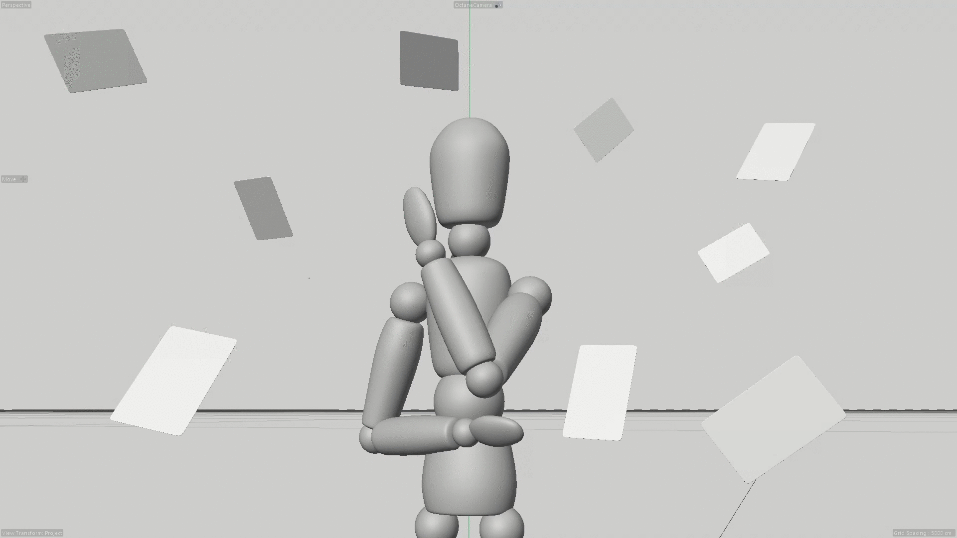 3D animated mannequin figure with a large head, surrounded by falling white and gray rectangular cards in a minimalistic gray environment.