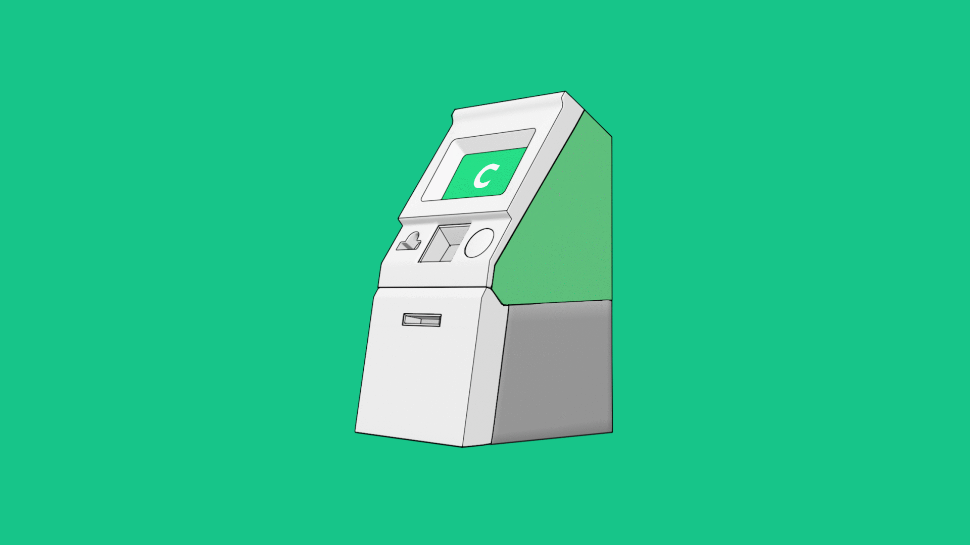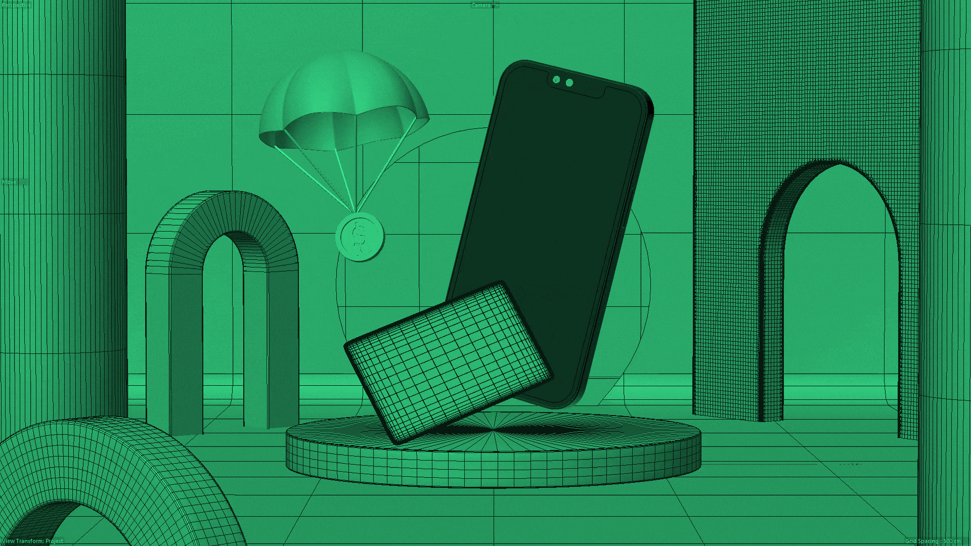 3D animated Digital illustration gif of a vending machine with a green and gray color scheme, set against a teal background.