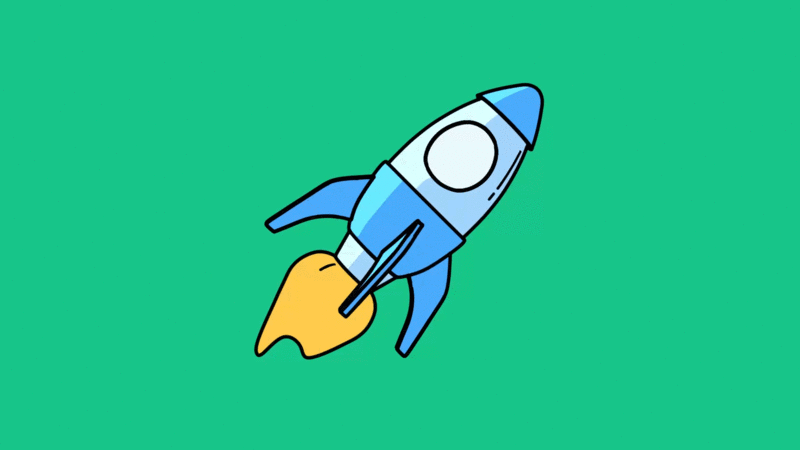3D animated gif Cartoon rocket ship rotating as it is launching with flames, set against a green background.