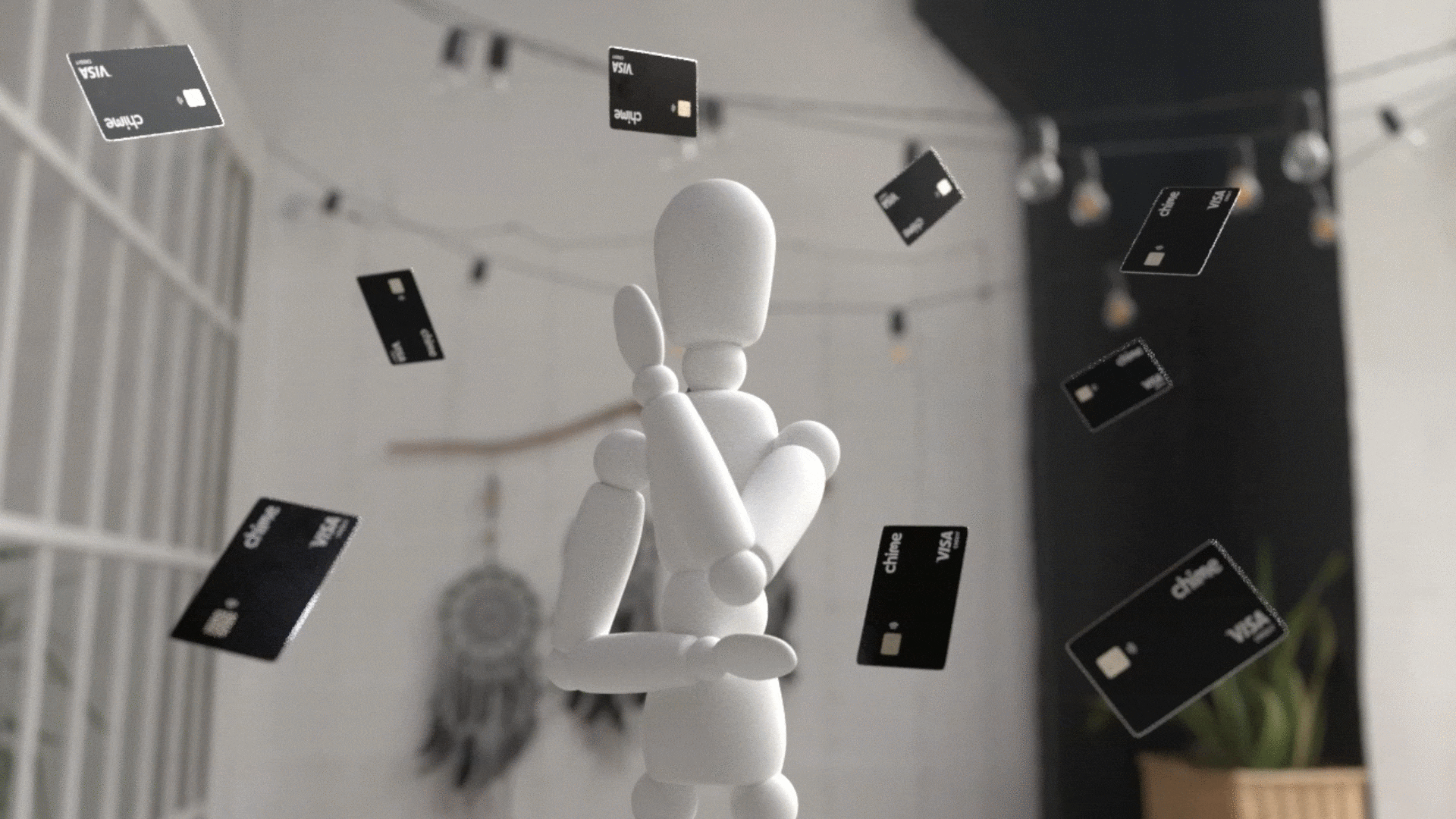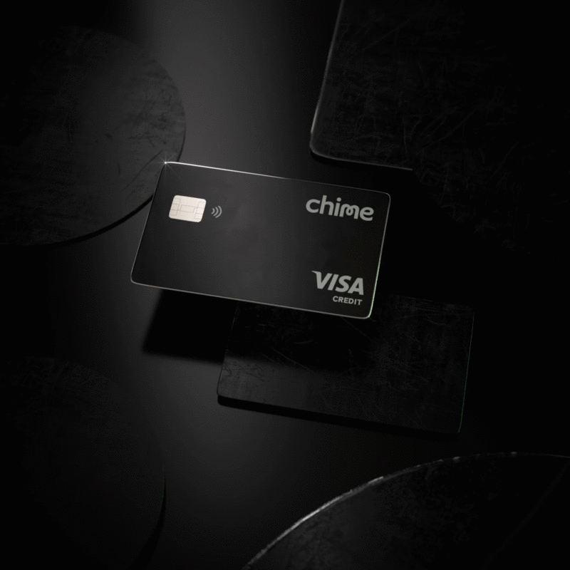 A 3D gif of a black Chime Visa credit card with a contactless symbol, placed on a black table with dark objects surrounding it, including a rounded black coaster or plate and a rectangular object.