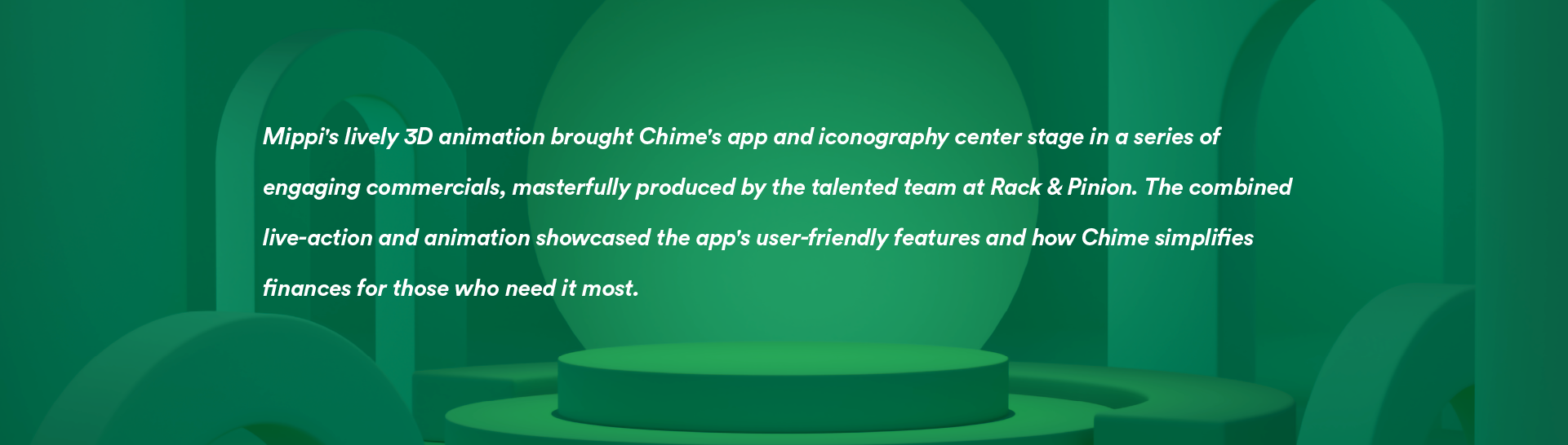 Green background with white text describing Mippi's animated commercial for Chime's app and iconography center stage. The scene includes a 3D animation showcase on a multi-tiered platform.