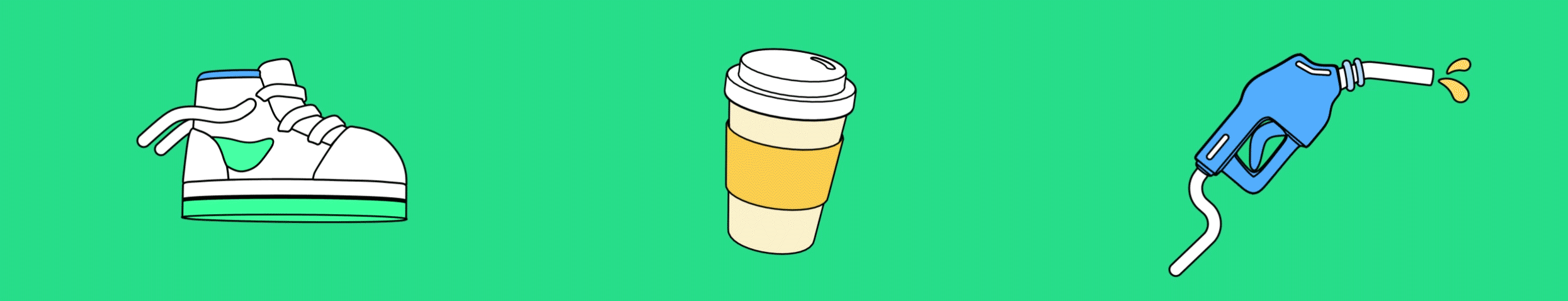 Illustration of a sneaker, a disposable coffee cup, and a fuel pump nozzle with gasoline.