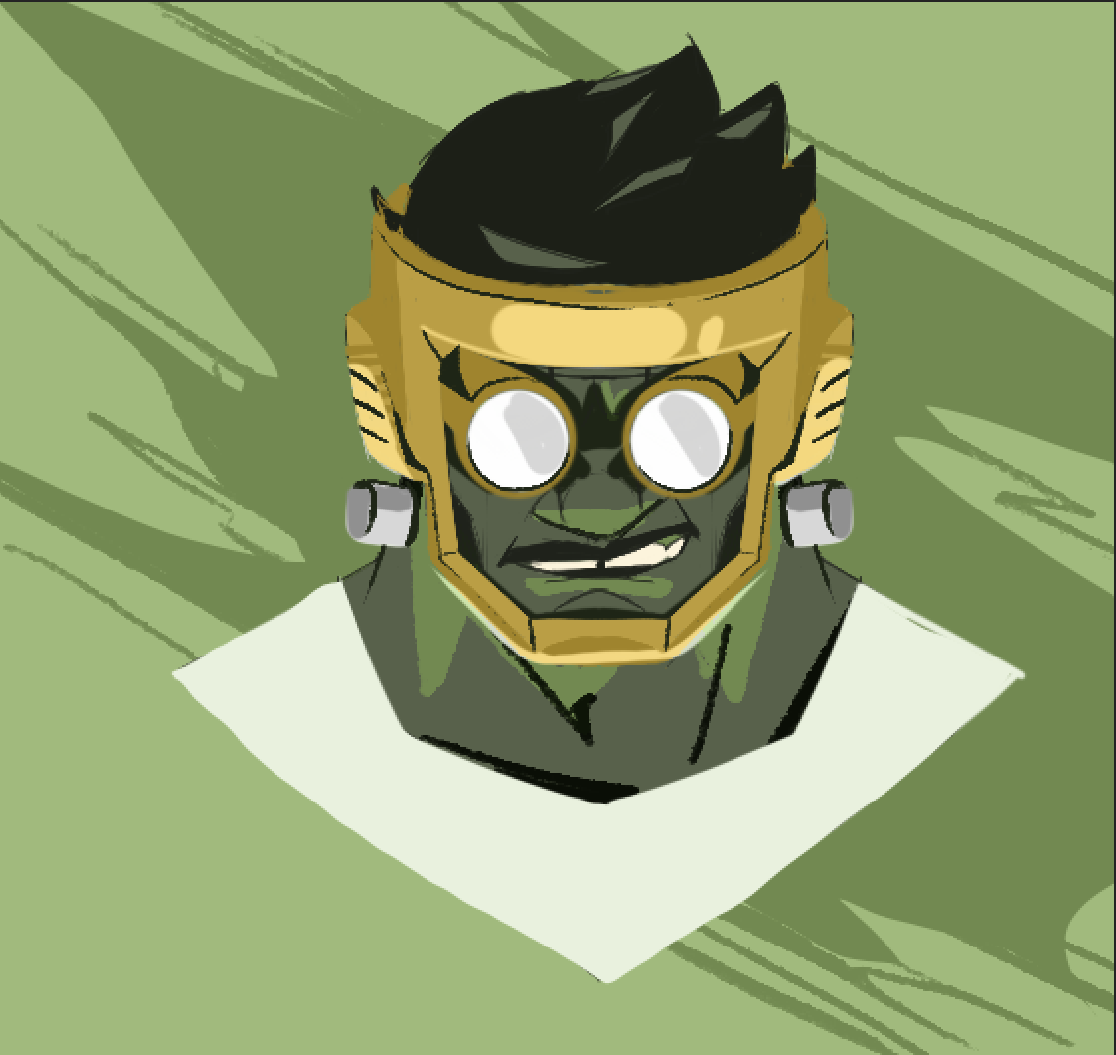 A stylized illustration of a character with black hair, Frankenstein, wearing goggles and a gold mask, with a green background and abstract lines.