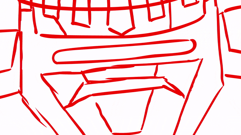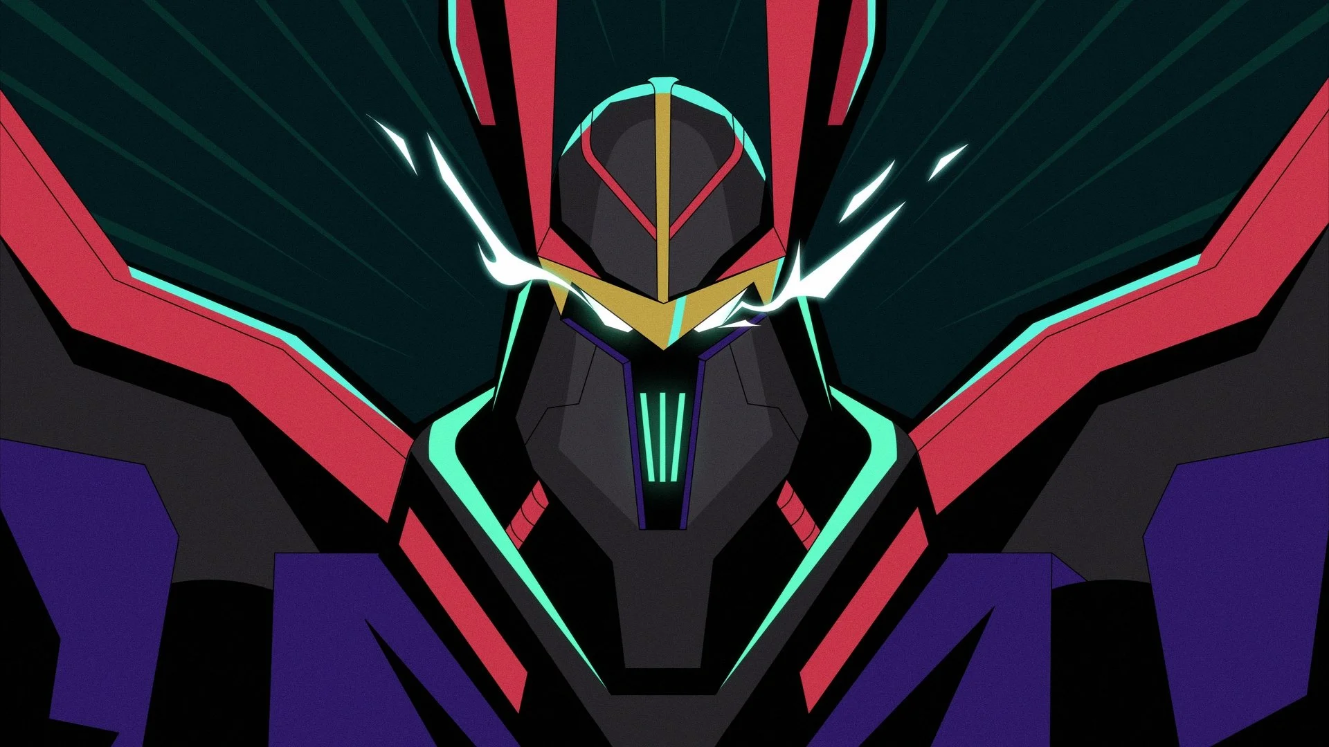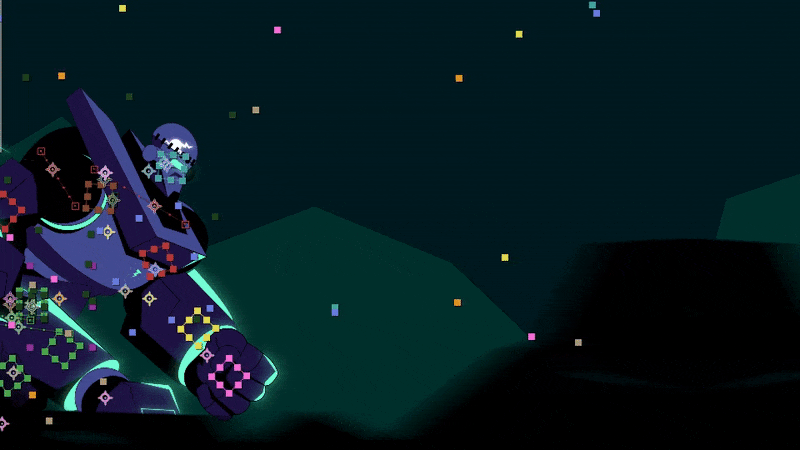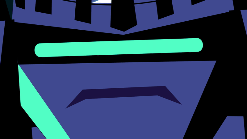 Close-up of a stylized robot face with blue and green features on a black background. Animation of a mecha winding up to take a punch.