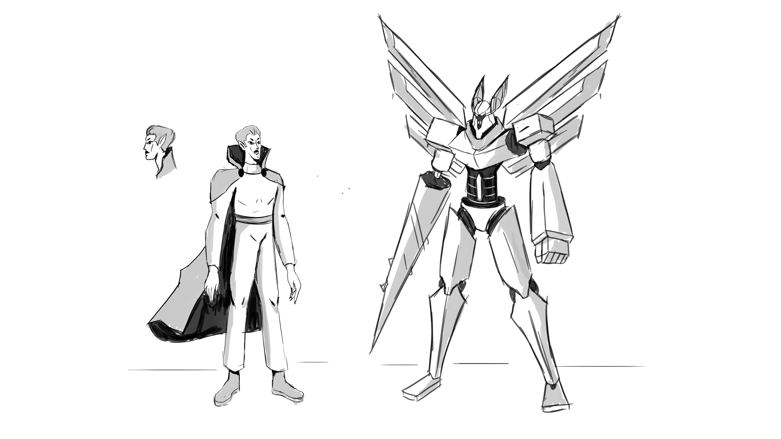 Sketch of two characters: Dracula in a futuristic outfit with a cape, and a large robotic humanoid Gundam with angular armor and weapons.