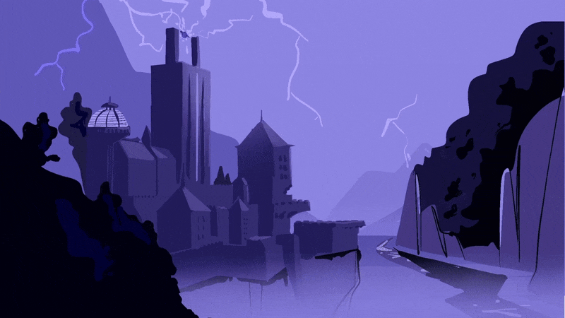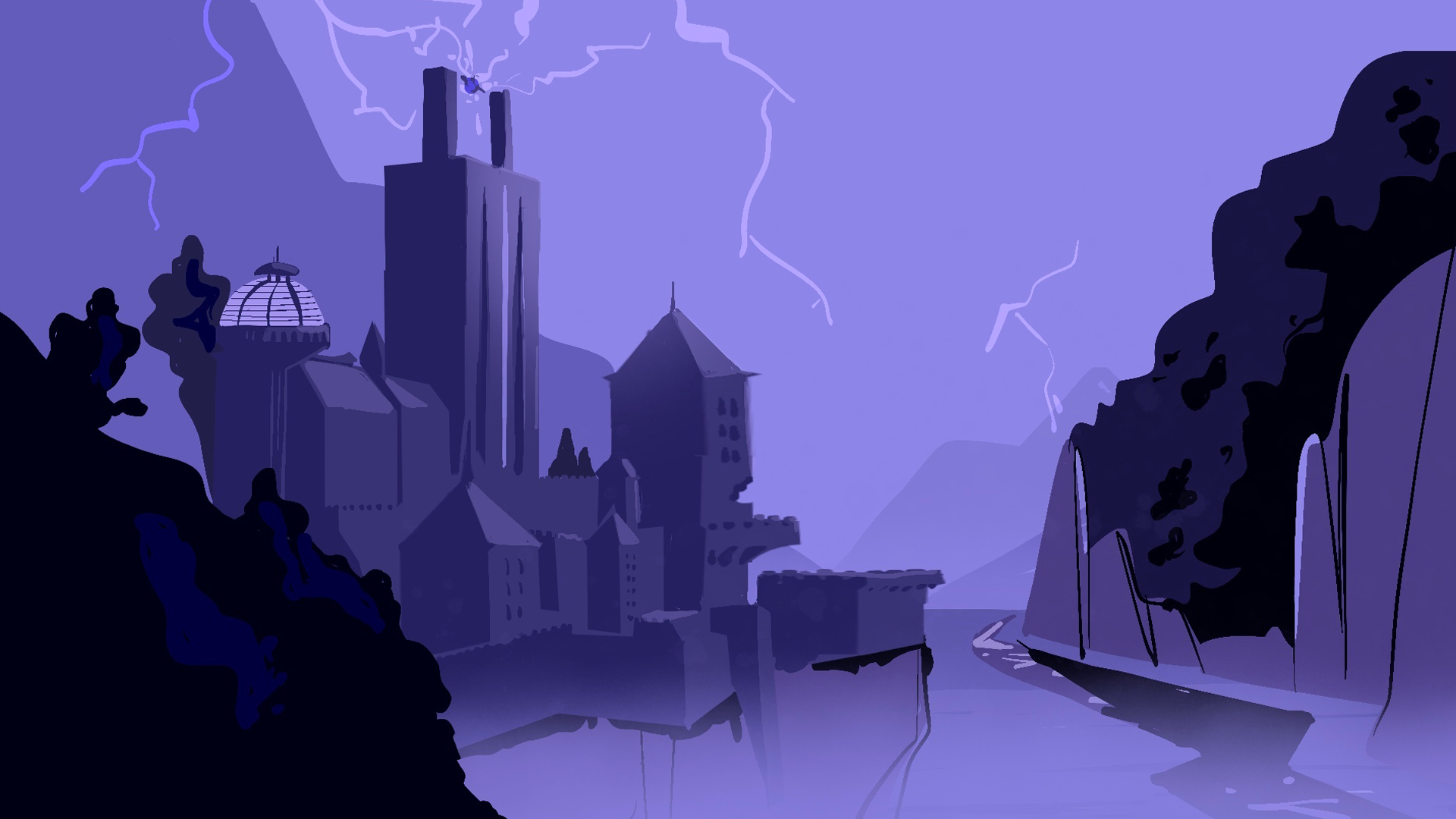 Illustration of a castle-like cityscape during a thunderstorm with lightning in the sky and a river in the foreground.