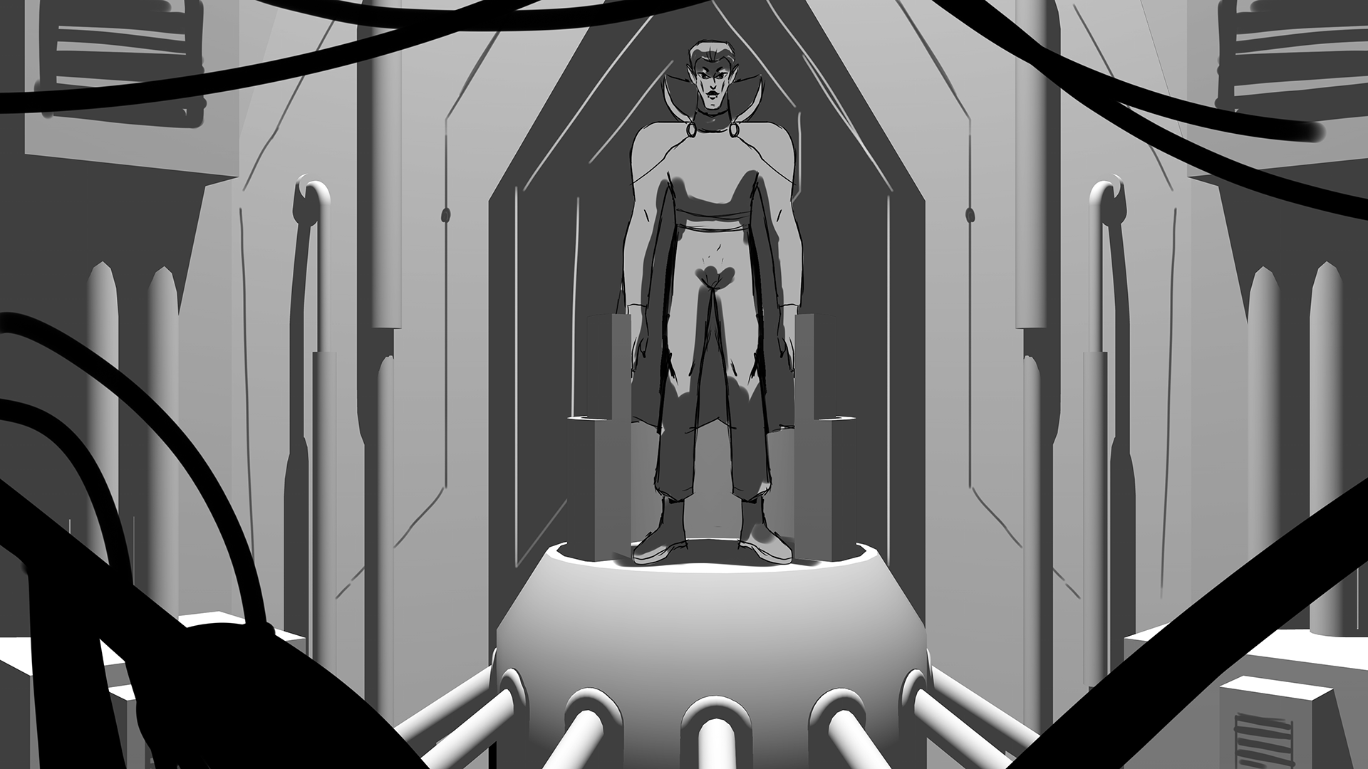 Dracula standing inside a futuristic laboratory with tubes and machinery, illuminated by light from above and behind.