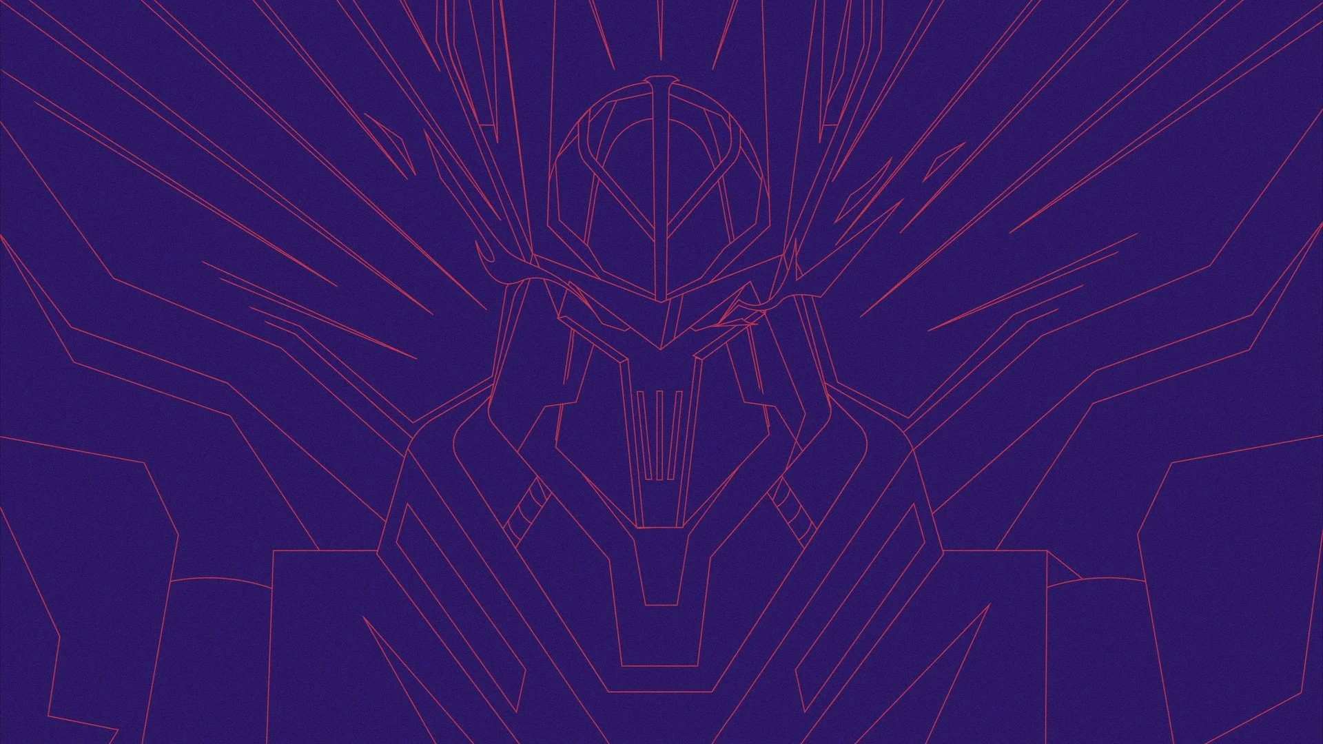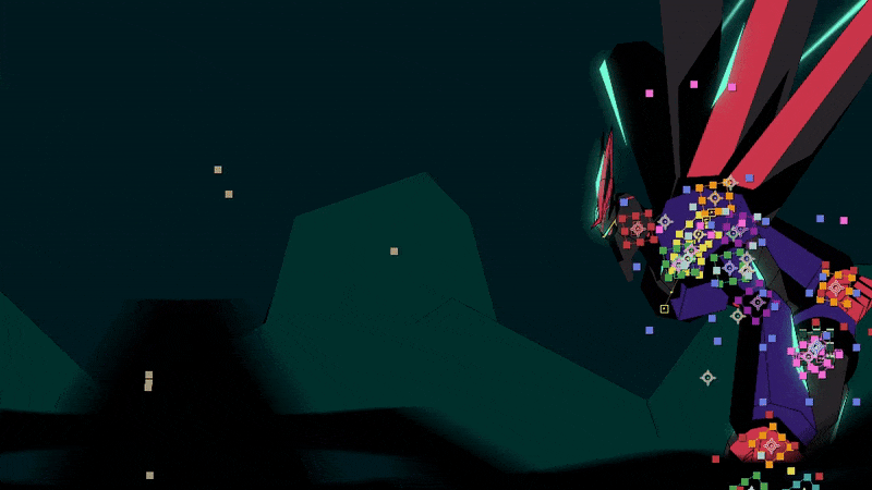 Digital art of a dark scene with abstract, colorful, geometric shapes and lines. Run cycle animation of a bat mecha.