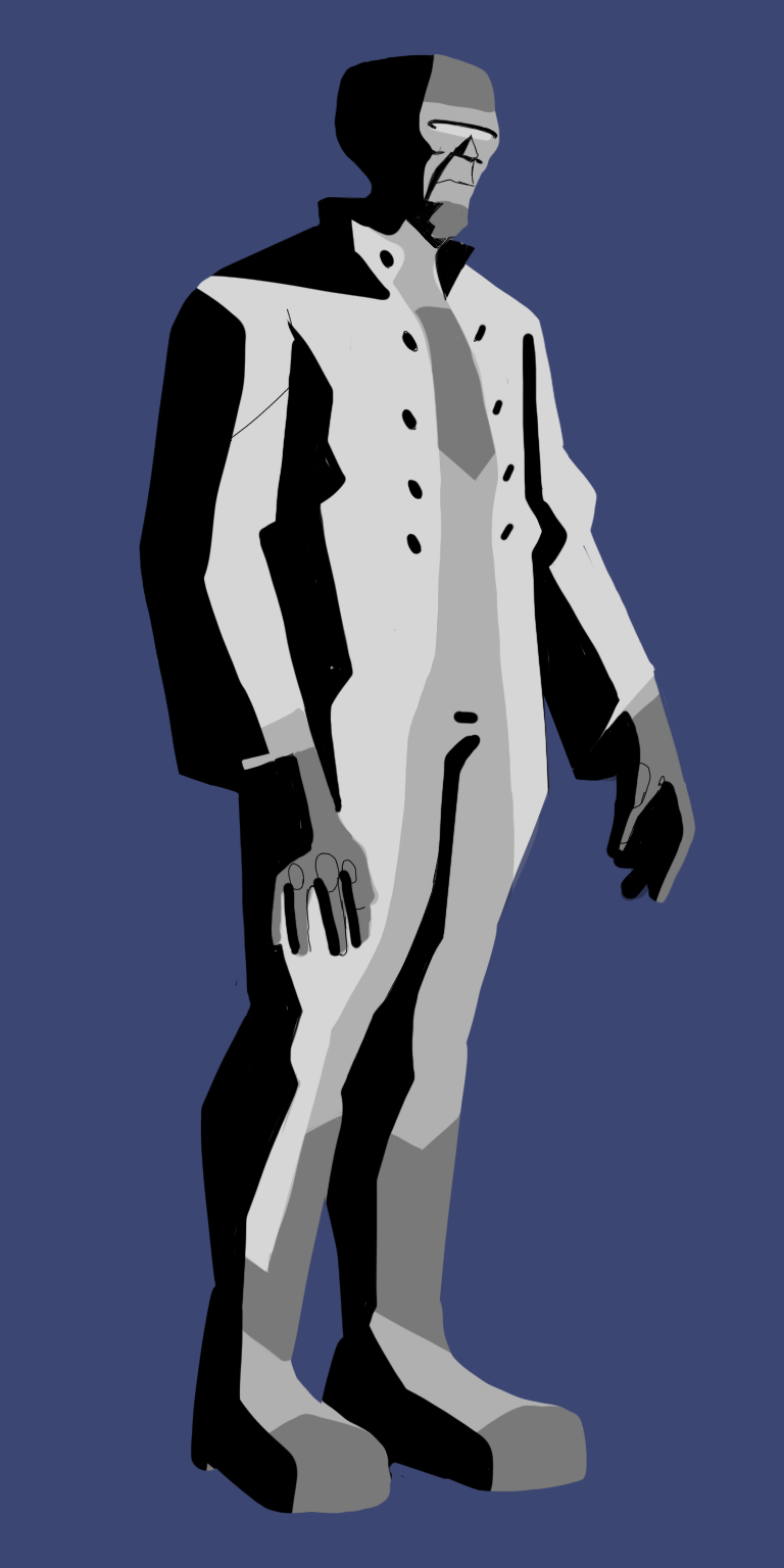 Digital illustration of Frankenstein with a metallic face mask, dressed in a tuxedo-like suit, standing against a solid blue background.