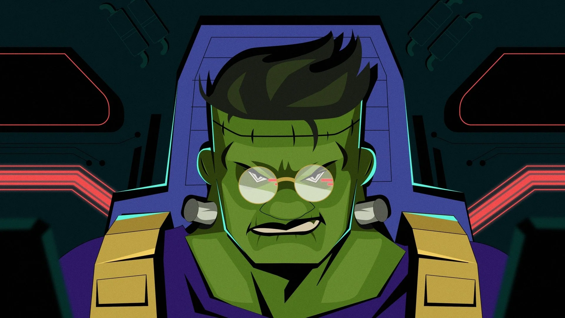 Animated depiction of a green-skinned character resembling Dracula with a stern expression, wearing round glasses and a purple and yellow outfit, inside a high-tech vehicle or Gundam Cockpit with digital displays and control panels.