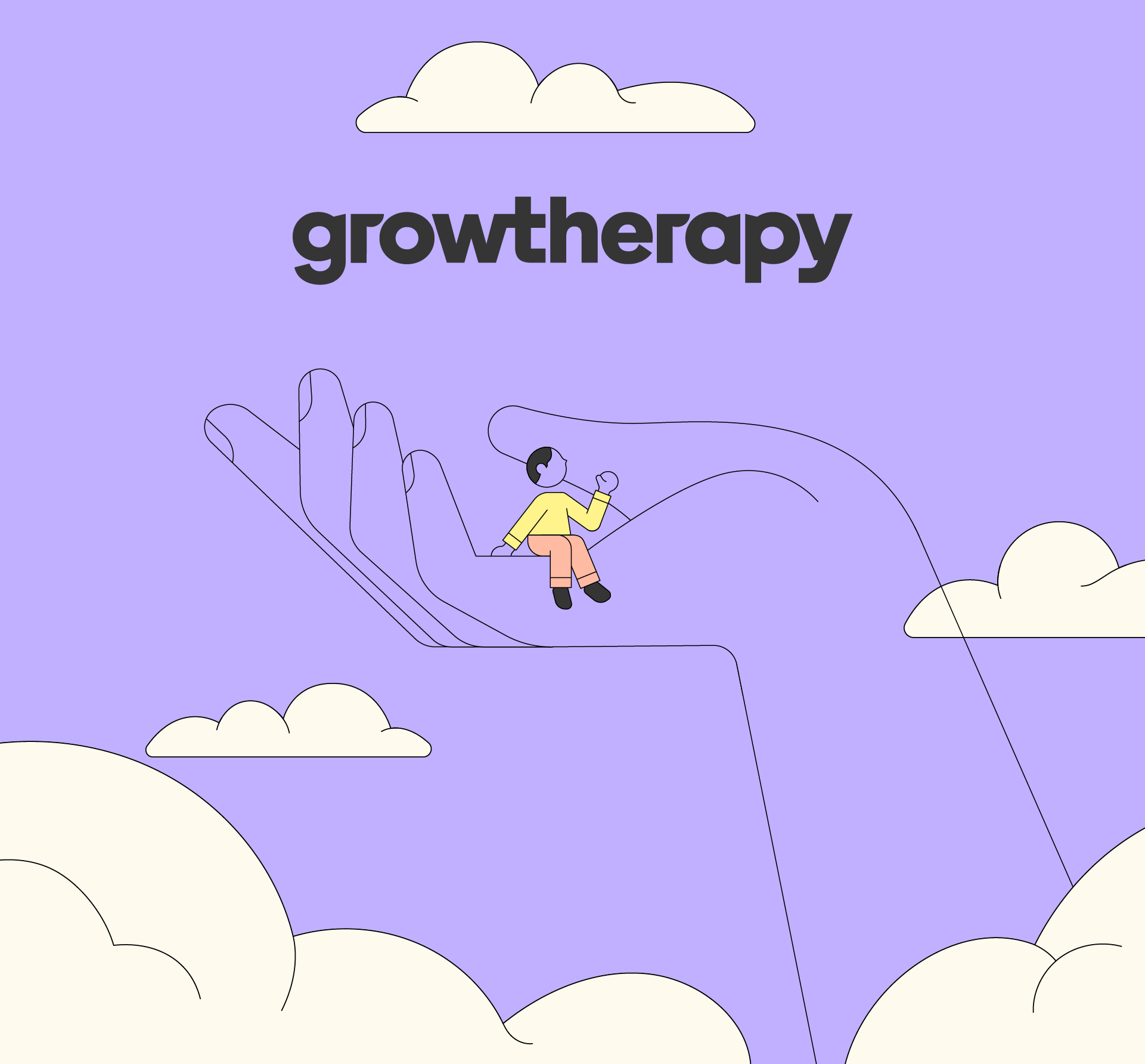 Illustration of a person being uplifted, sitting on a giant hand in the sky with clouds and the word 'growtherapy' above.