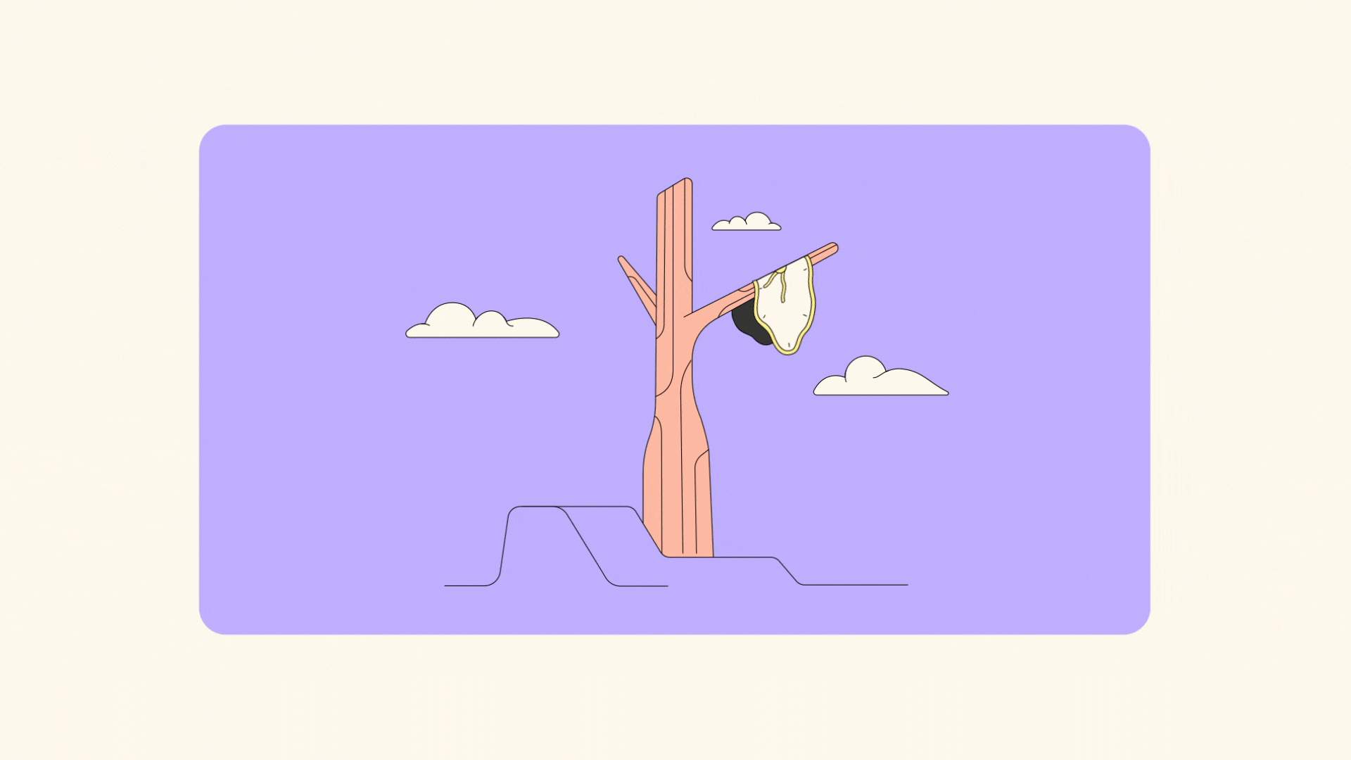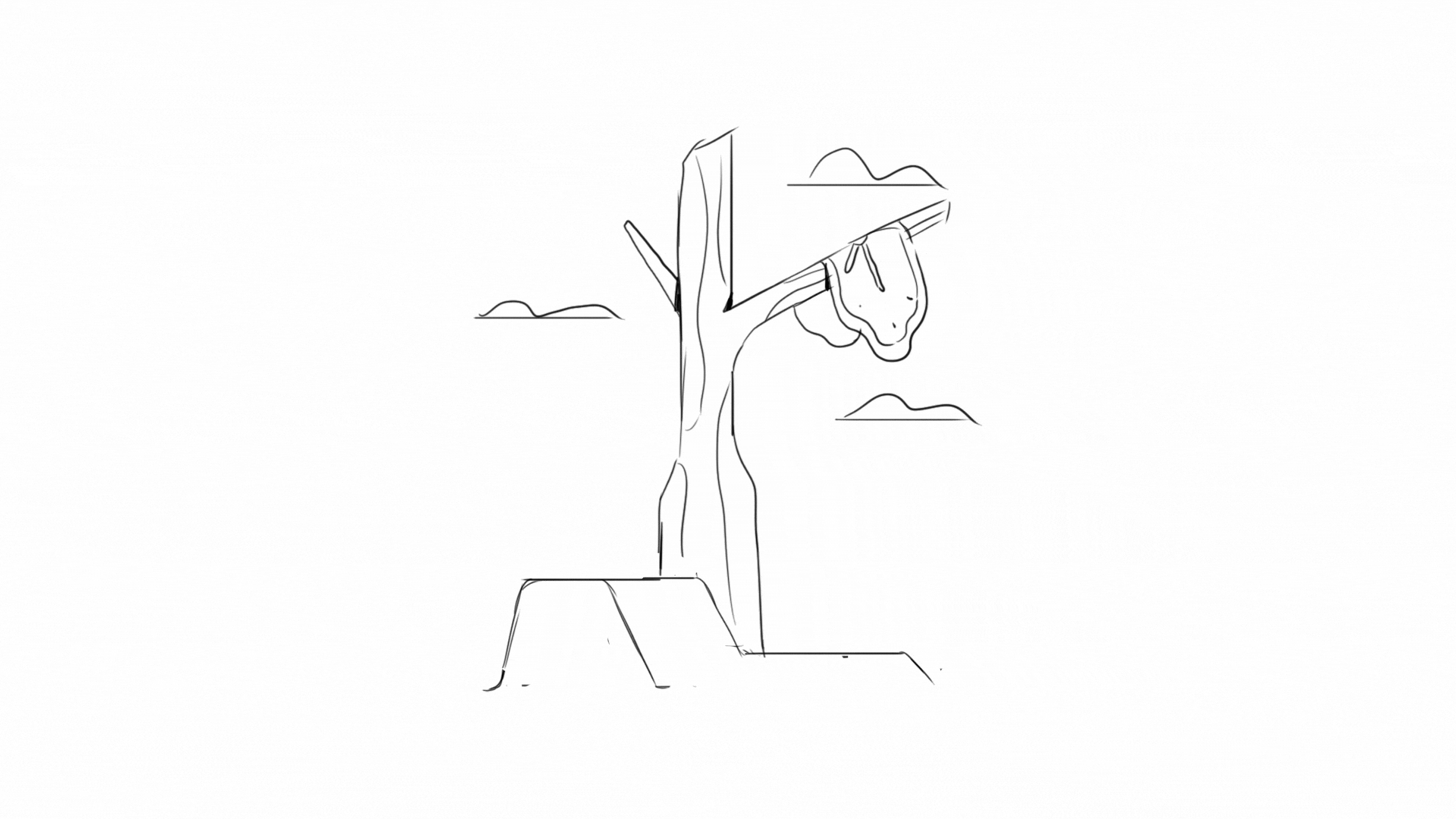 A simple line drawing of a tree with a melting clock and small clouds in the sky. Inspiration from Salvador Dali.