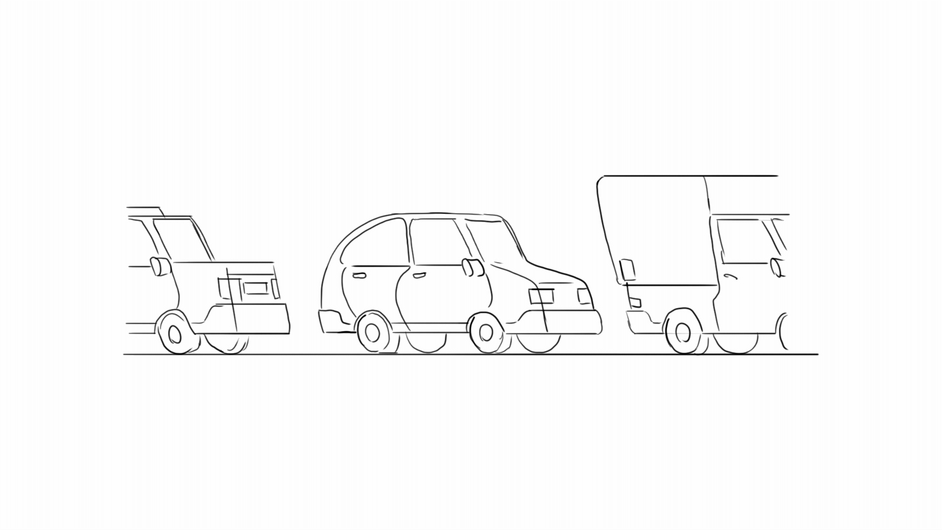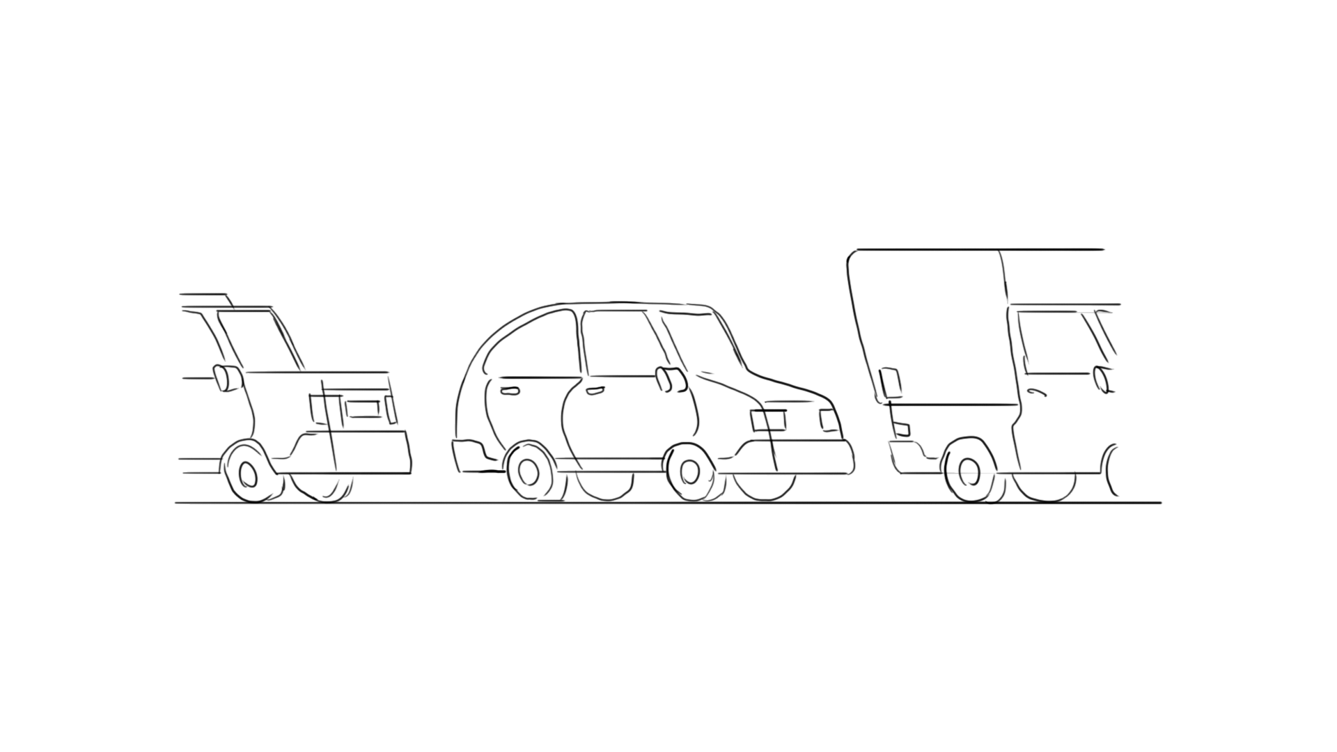 Line drawing of three vehicles parked side by side, each with distinct shapes and sizes, on a plain background.