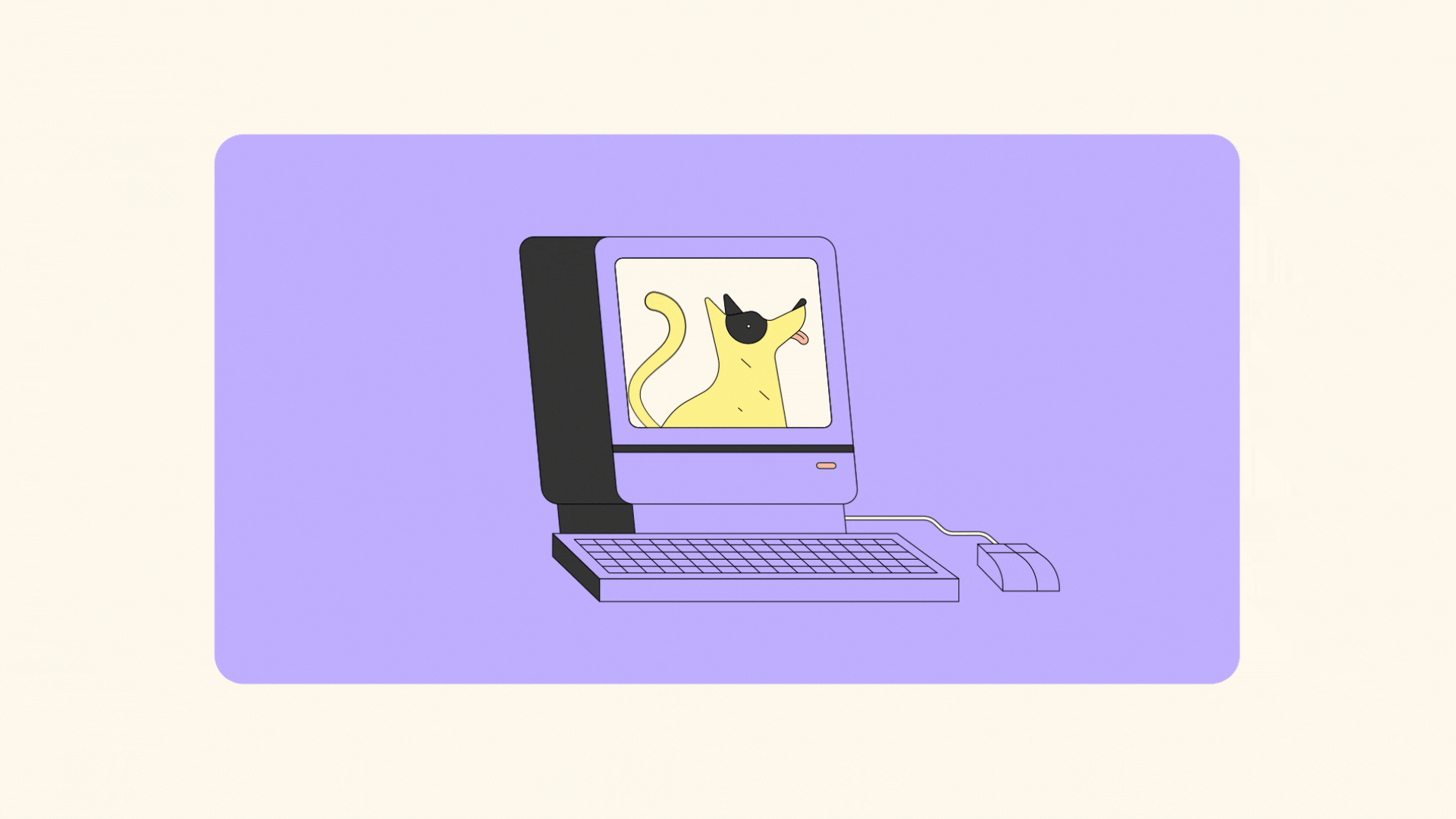 A retro-style computer with a purple frame and keyboard displays a cartoon yellow dog with a black patch over one eye, sticking out its tongue. Animated illustration of a dog wagging tail inside a screen.
