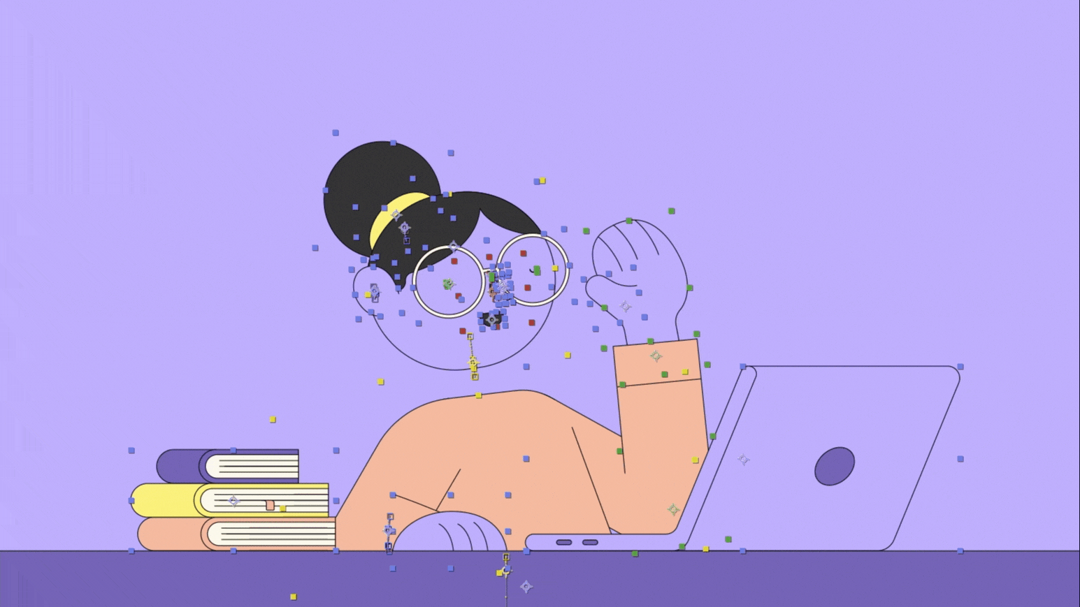 Illustration of a therapist person sitting at a desk with books, a laptop  on a desk against a purple background.