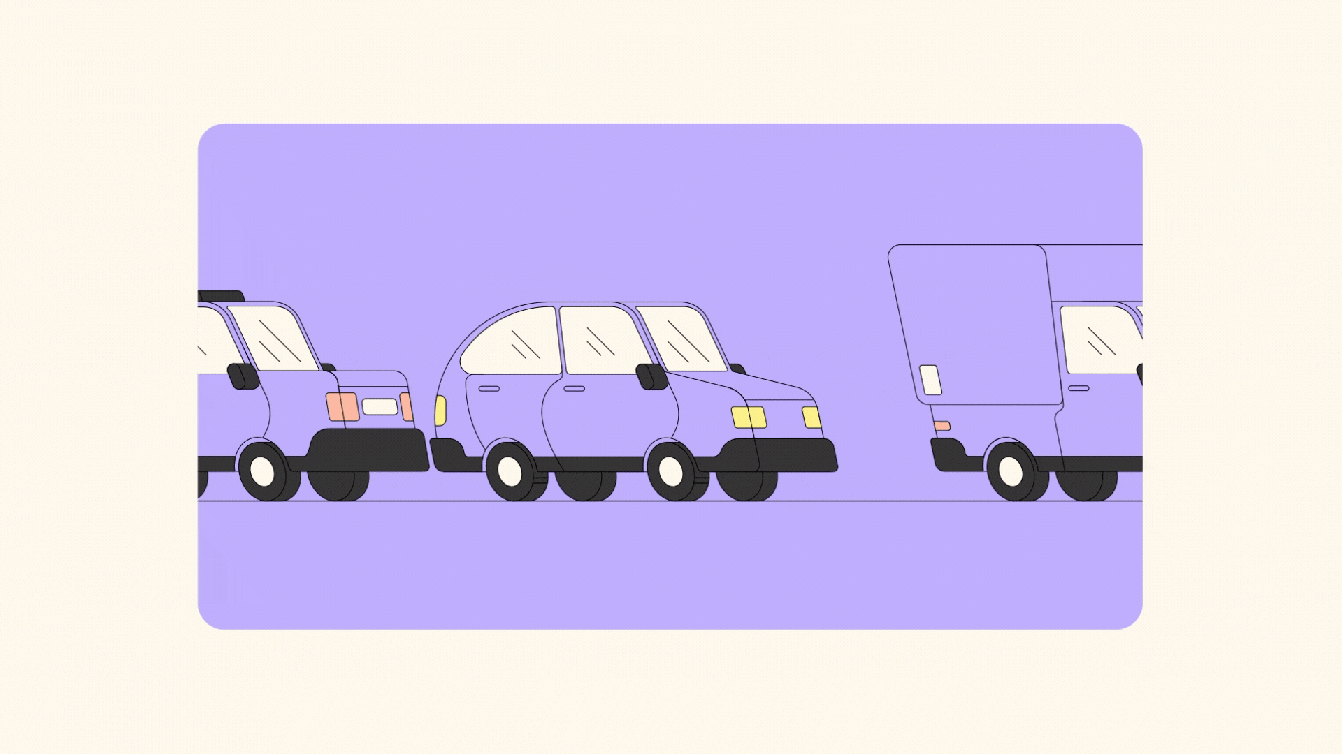 Illustration of purple vehicles stuck in traffic on a purple background. Animated gif of a car shifting back and fourth in traffic