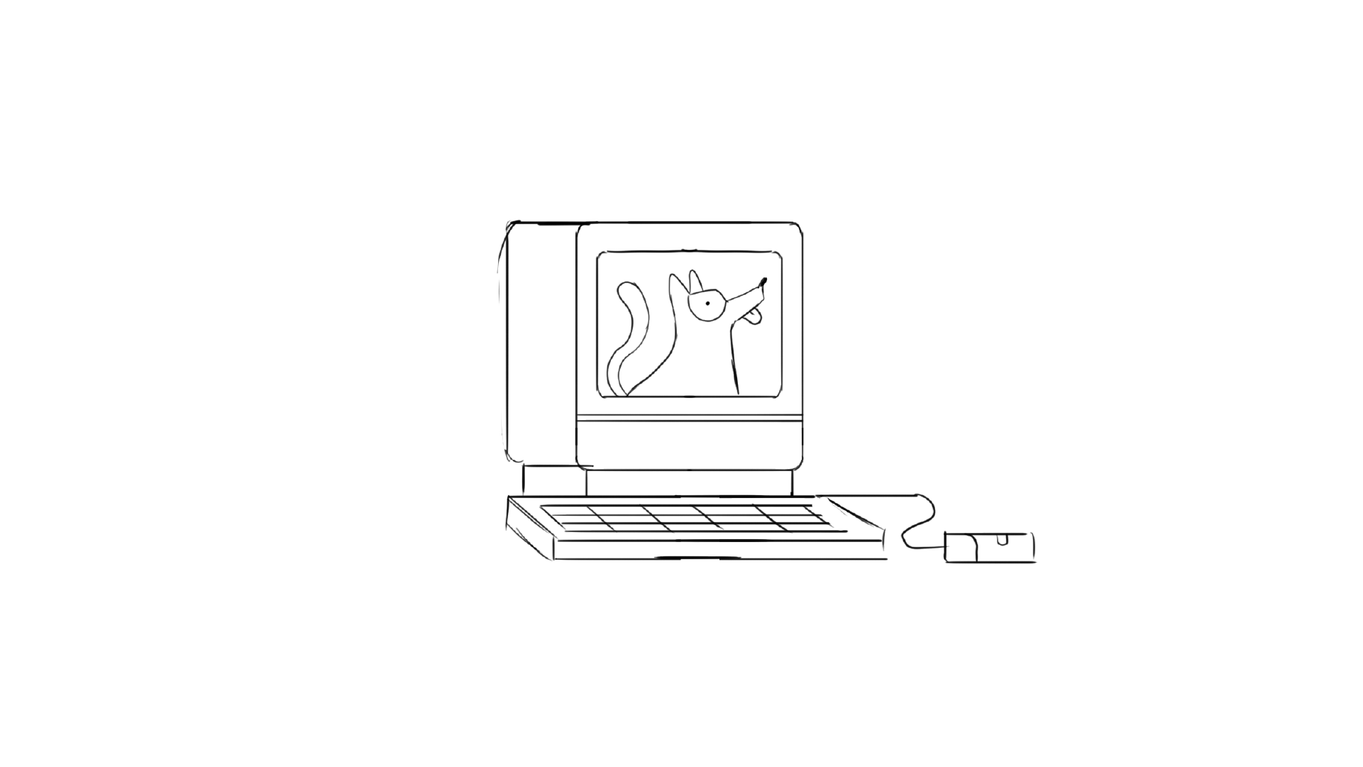 Line drawing of a vintage computer with a dogs's head on the screen, tail wagging back and fourth.