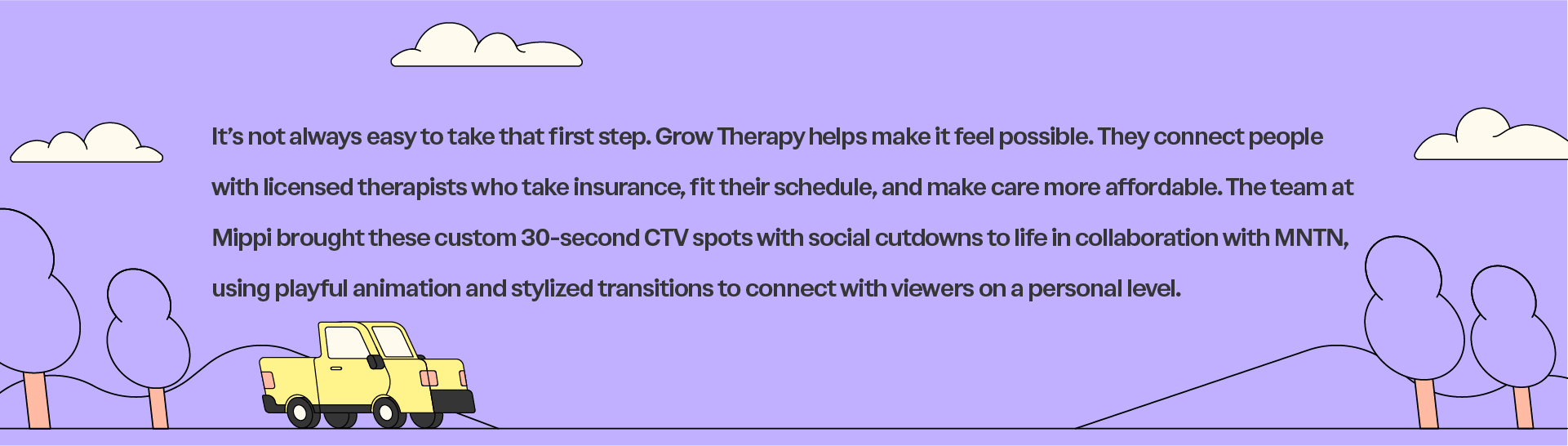 Purple background with cartoon trees, clouds, and a yellow truck, along with text about Grow Therapy and custom 30-second TV spots for social cutdowns.