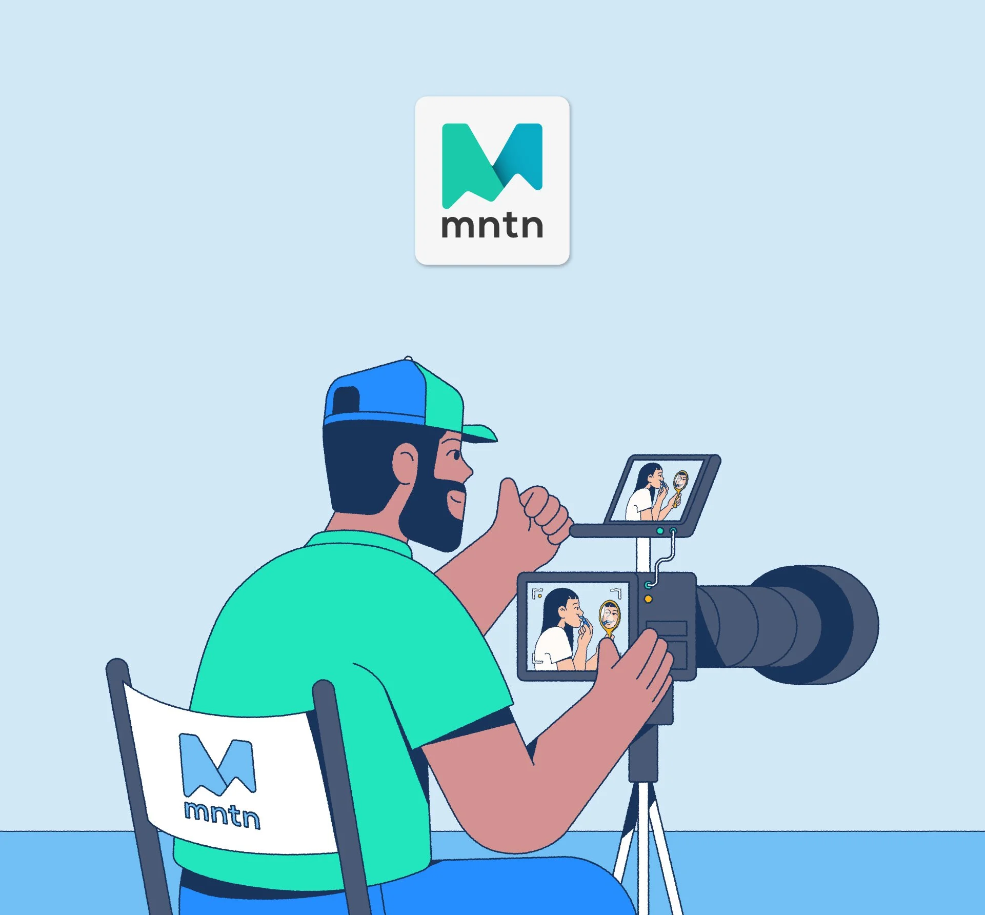 An illustrated person with a beard, wearing a cap and mint green shirt, is filming a woman. The camera displays the woman's face being recorded, and there is a logo with a mountain and the letters 'Mntn' above them in the background.