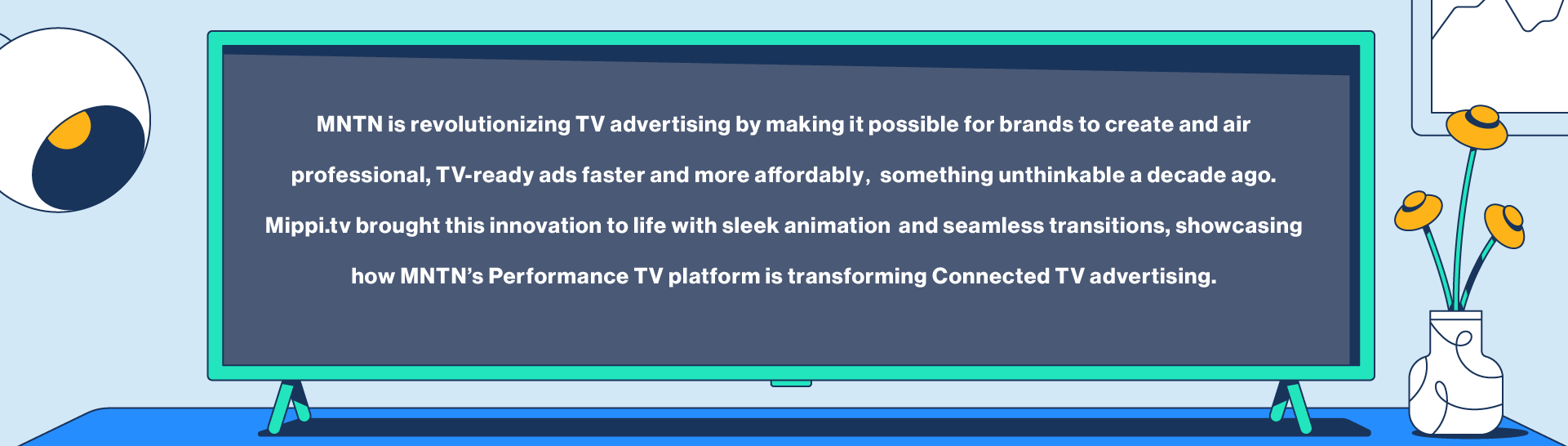 A television displaying a paragraph about MNTN's innovation in TV advertising, surrounded by a cartoonish living room setting with a flower vase and decorative wall elements.