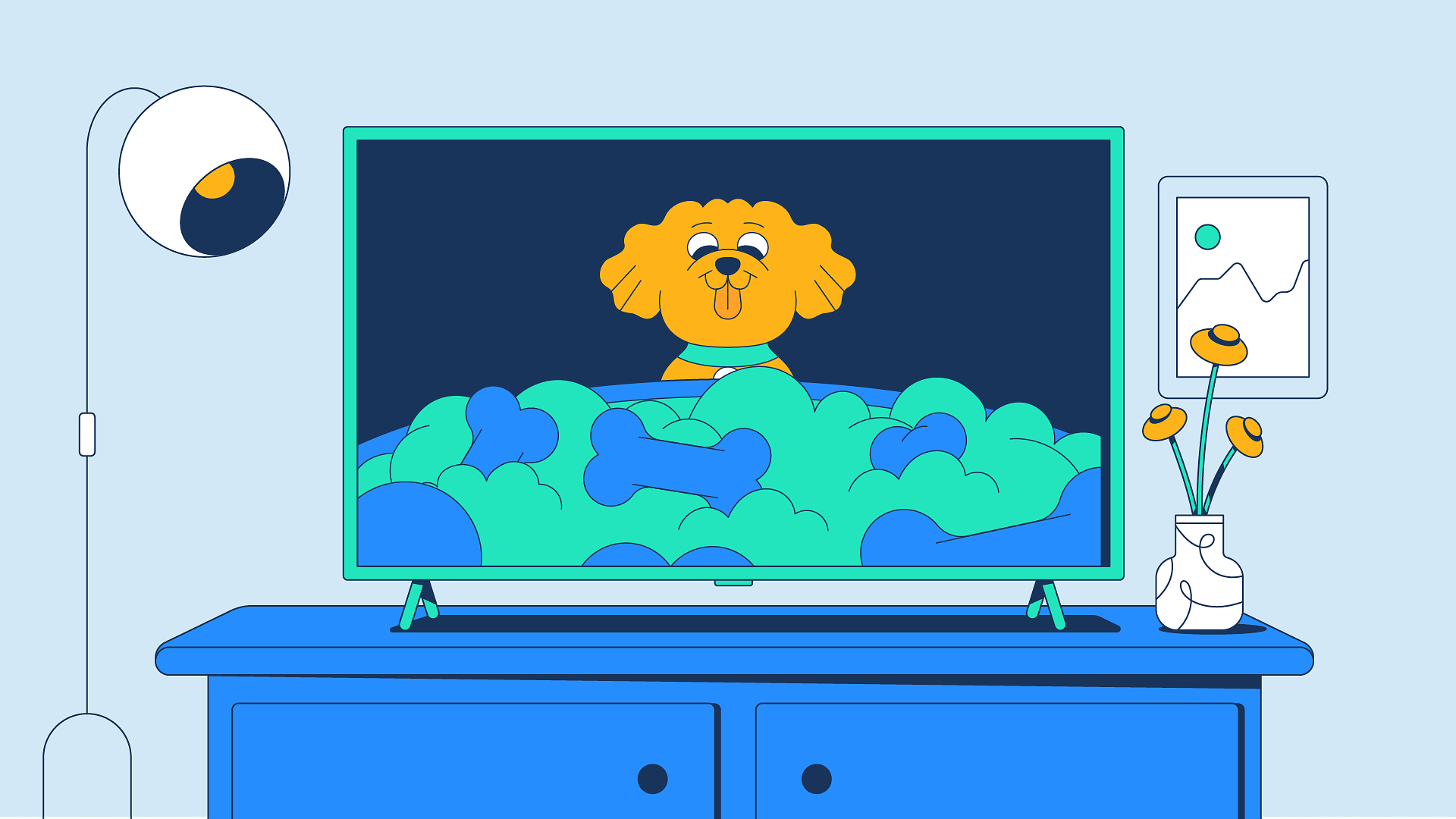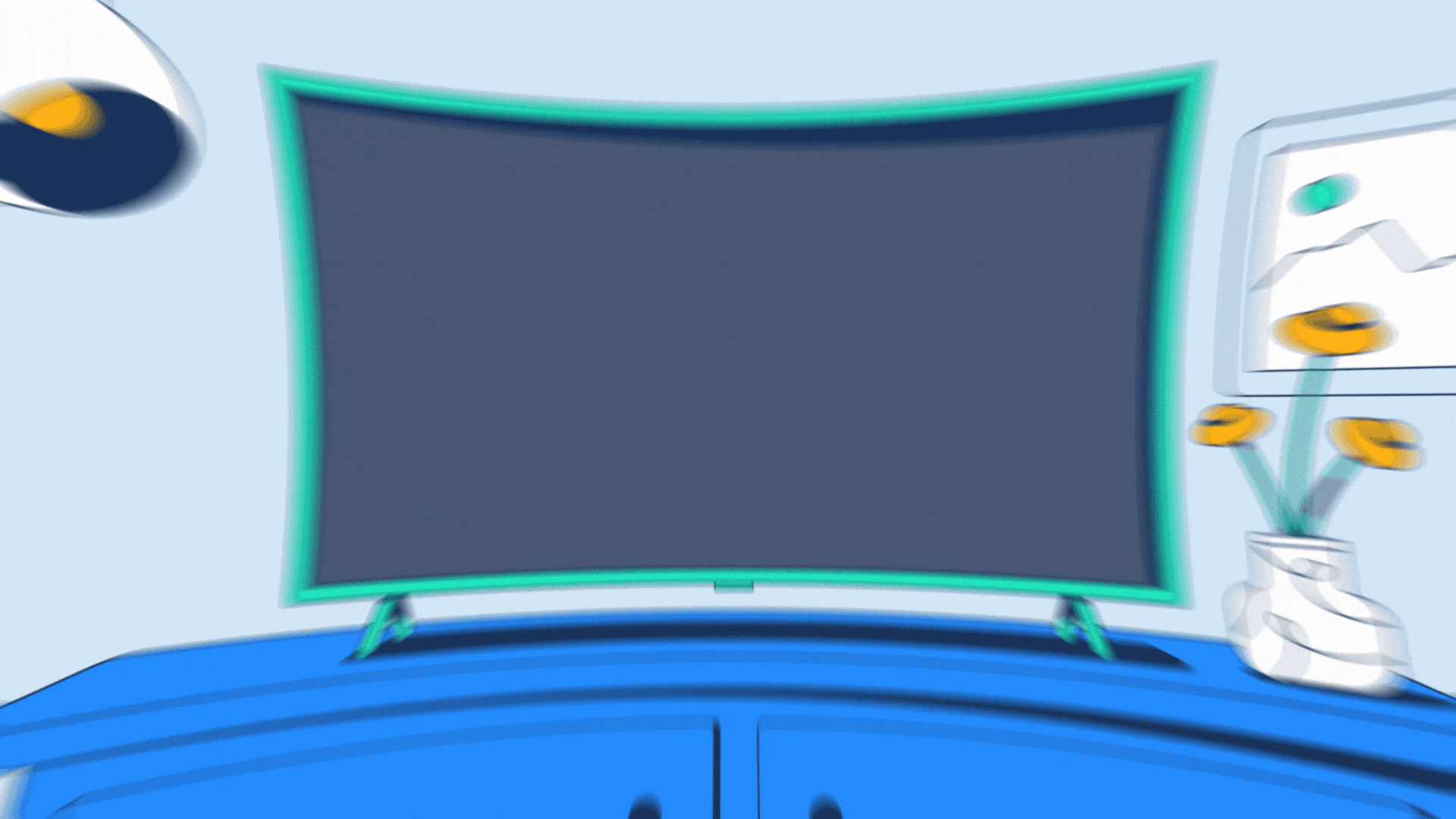 Digital illustration of a television on a blue cabinet, with a potted plant with yellow flowers and a framed picture on the wall in the background.