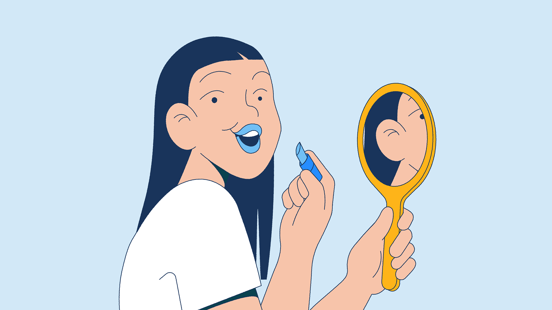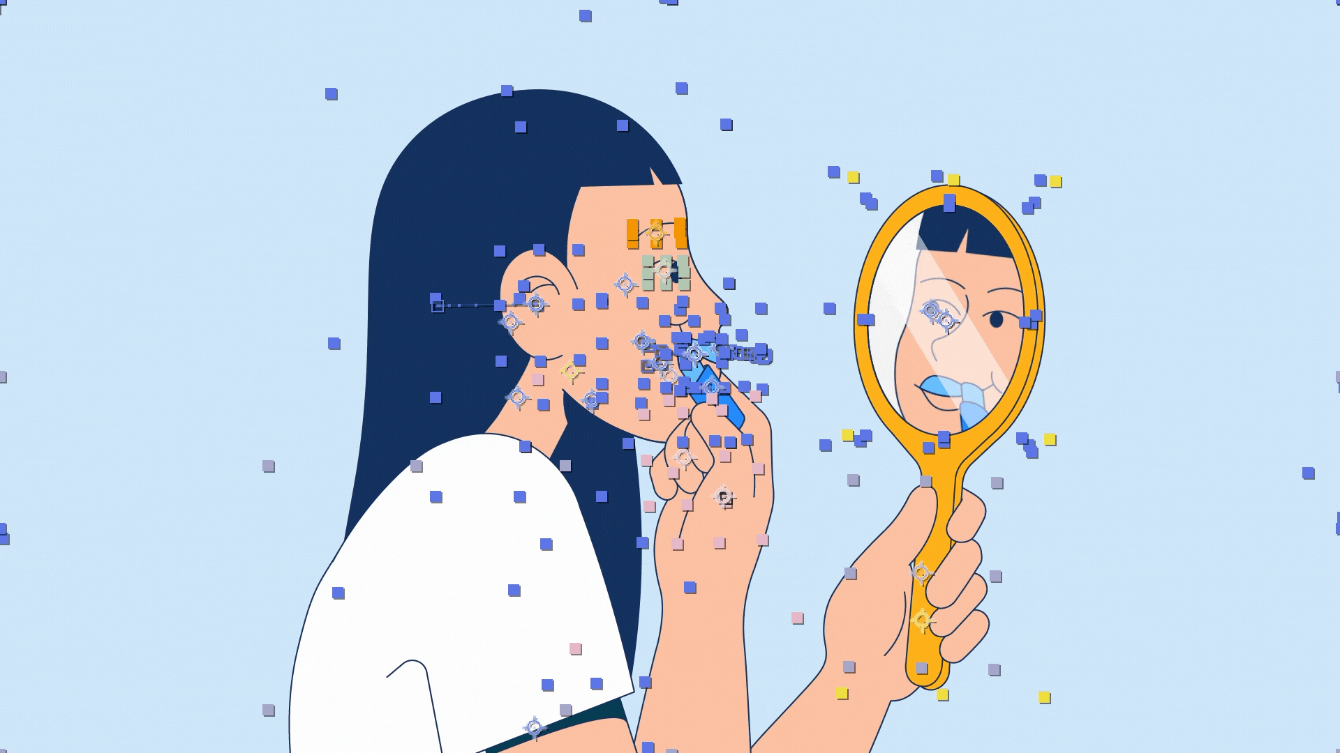 Animated gif showing process of A girl with long dark hair looking into a mirror and applying makeup, with keyframes showing animaton.