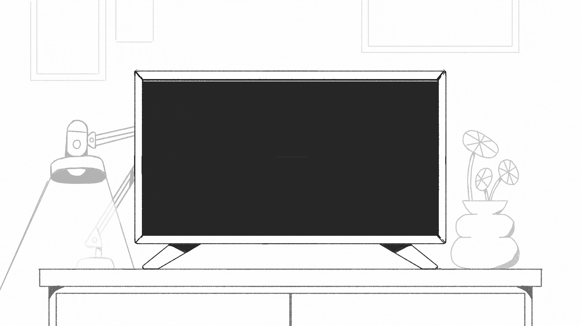 Animated gif of a Line drawing storyboard of a living room corner with a television on a stand, a lamp on the left, and a potted plant on the right, with framed pictures on the wall in the background.
