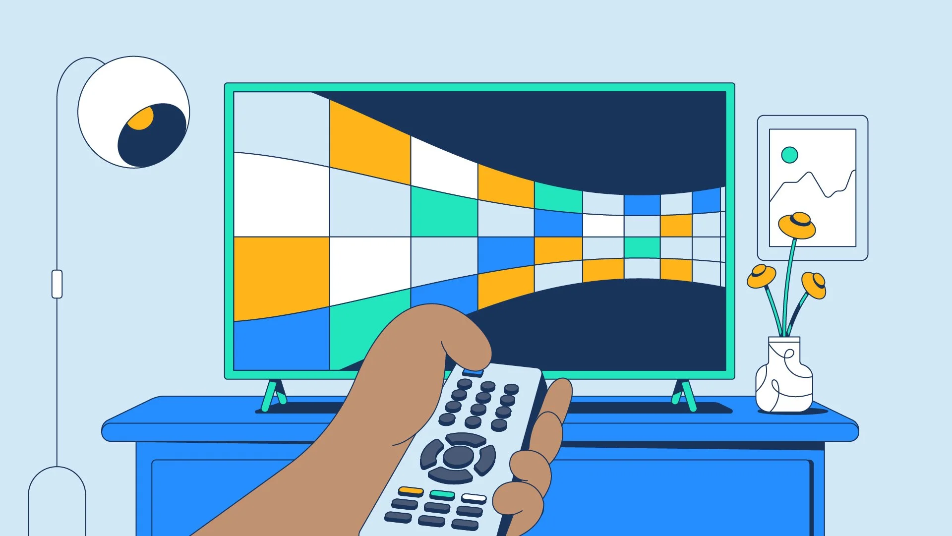 Person holding a remote control watching a television with a pattern of colorful squares on the screen, in a room decorated with a potted plant, a picture frame with a graph, and a ceiling light.