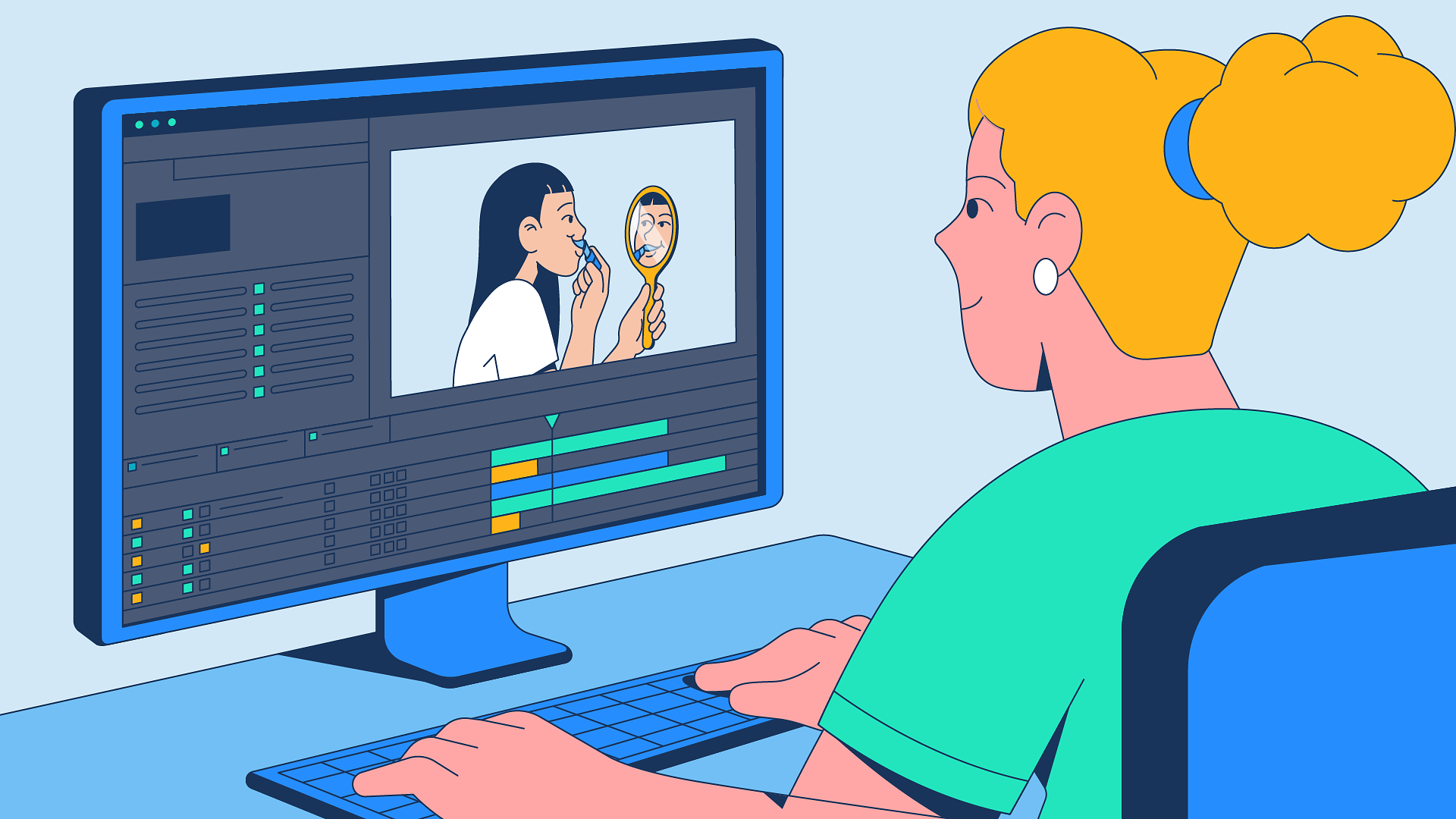 A woman with curly blonde hair styled in a large bun, wearing a teal top and white earrings, is sitting at a desk in front of a computer monitor. On the monitor, a video editing software is displayed with a woman applying lipstick in a mirror. The woman at the desk is working on editing the video.