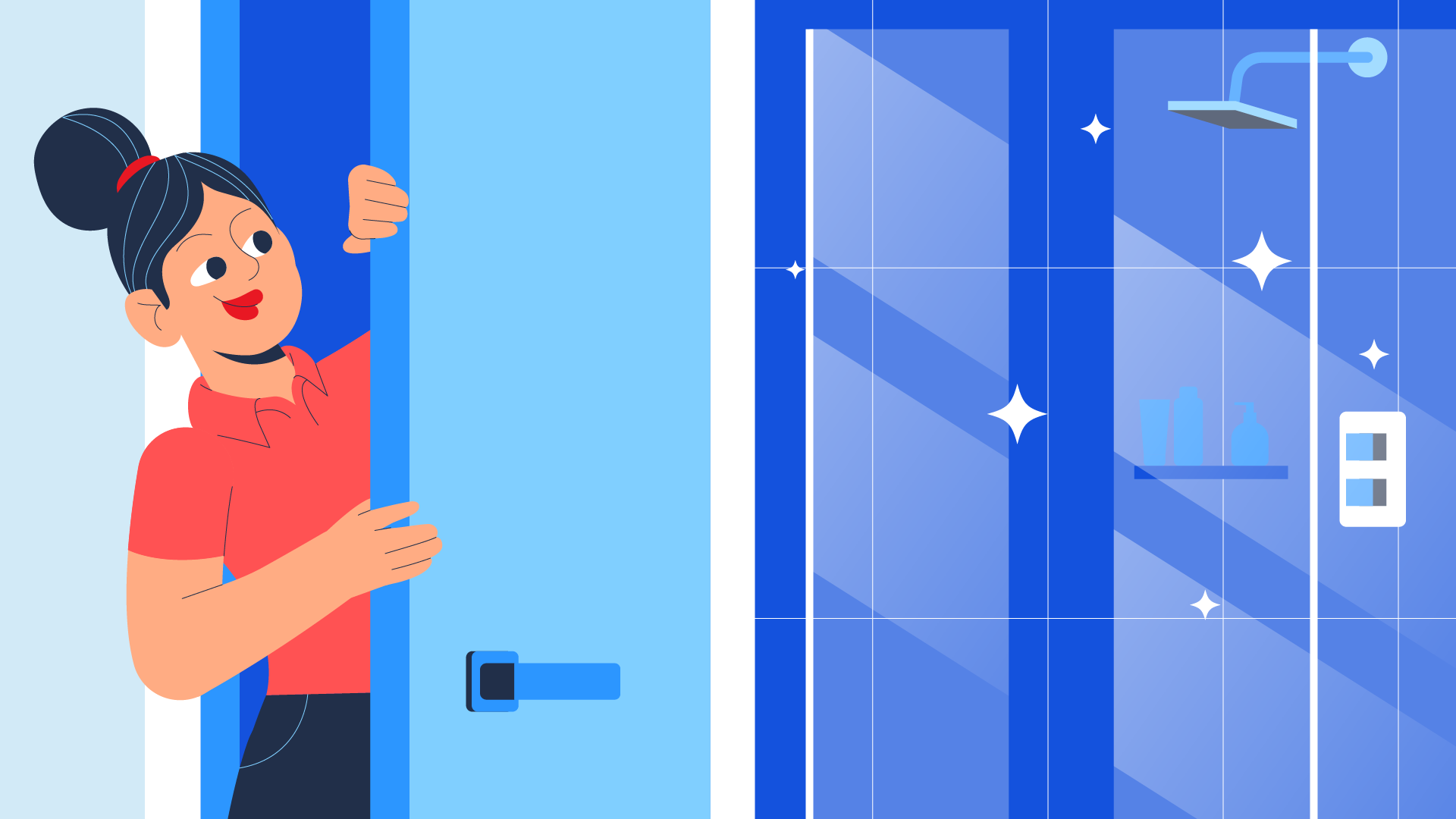 A woman with dark hair in a bun, wearing a red shirt, smiling and peeking into a bathroom with a blue door. Inside the newly renovated bathroom, there is a shower with a rain shower head, shelves with bottles, star-shaped gleams.