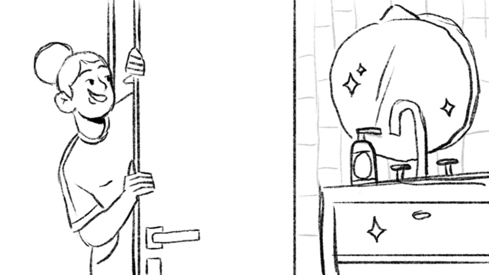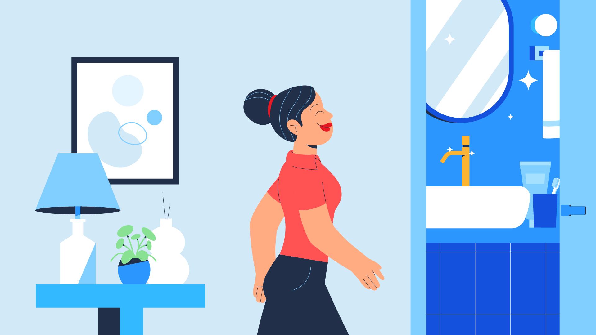 A woman smiling and walking past a renovated bathroom mirror with a sink, faucet, and toothbrush holder, in a brightly colored bathroom with blue tiles and decor.
