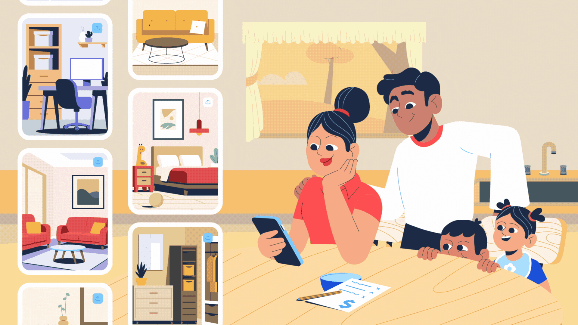 Family sitting around a dining table in a bright kitchen, looking at a phone, with various illustrated home interior scenes like the Pinterest UI on the left side of the image.
