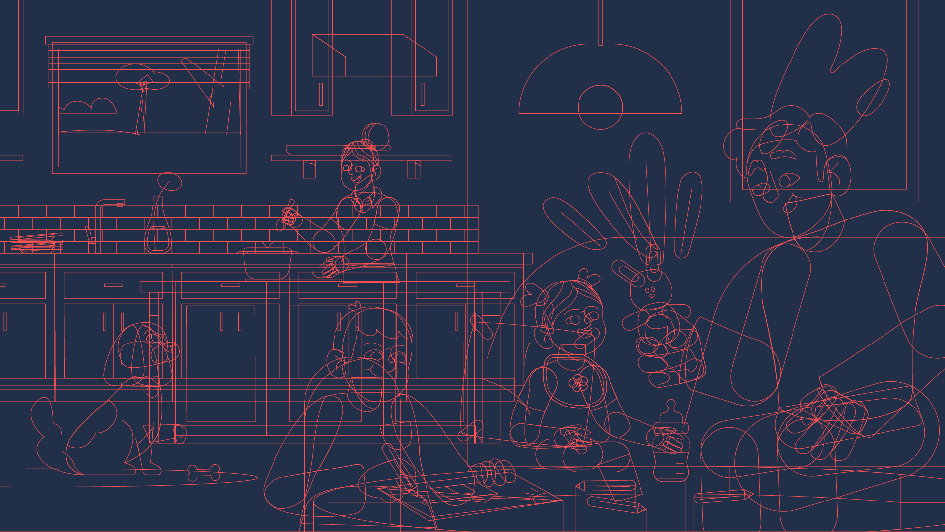 A family in a kitchen, with a woman cooking at the counter, two children sitting on the floor eating, and one child with bunny ears and a watering can, all depicted in a continuous line drawing style.