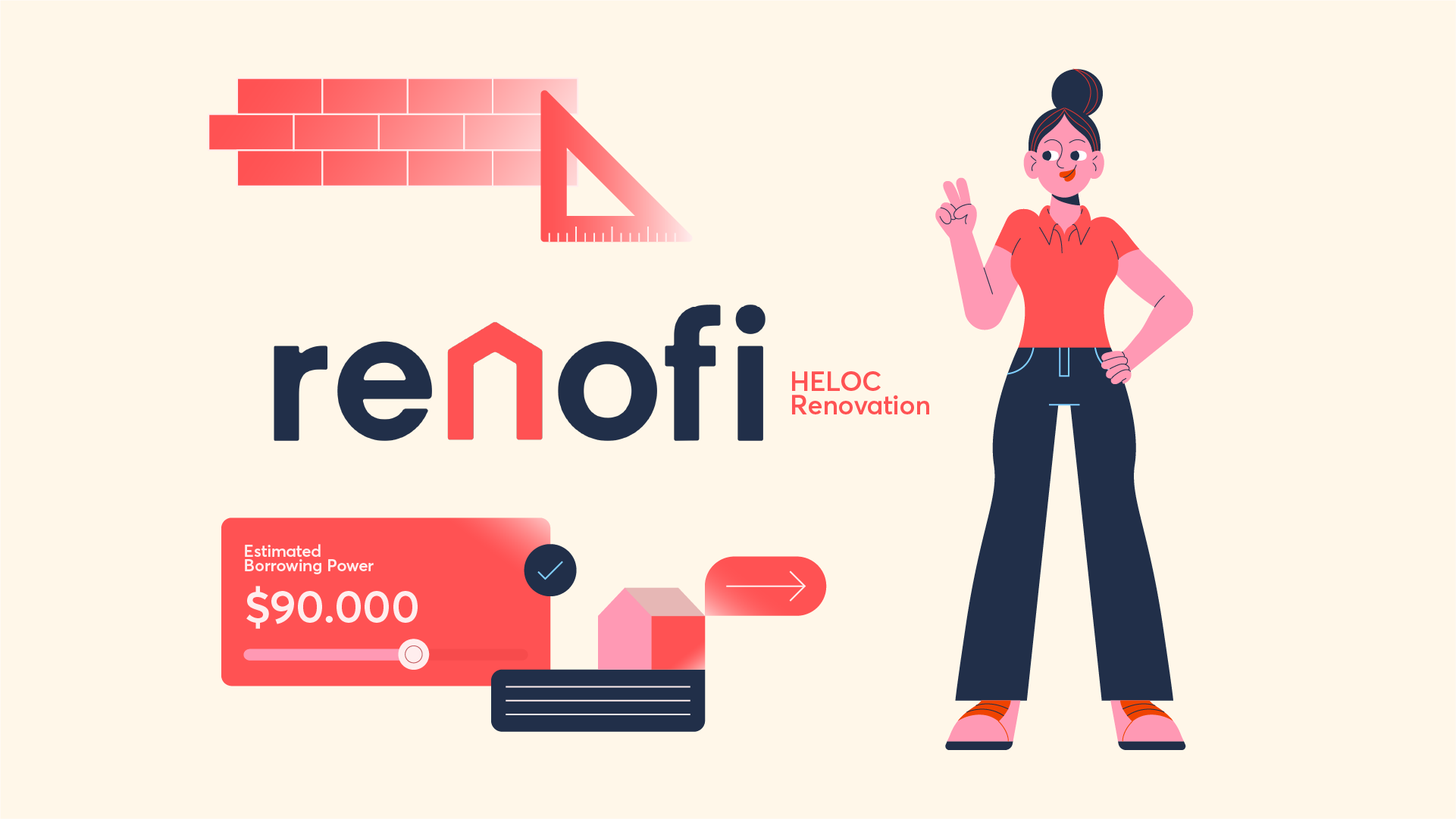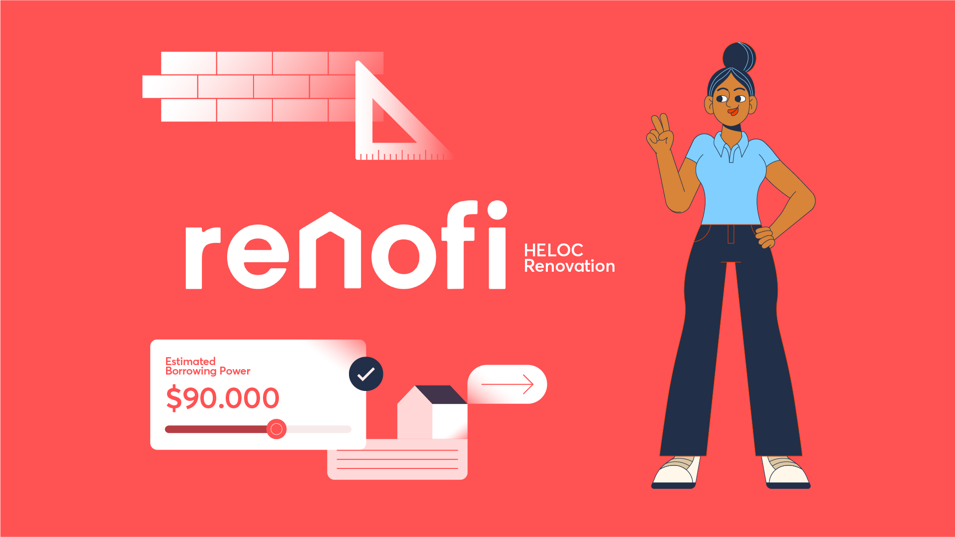 An illustrated woman standing with her left hand on her hip and right hand showing a peace sign. Behind her are graphics related to renovation, including a brick wall, a triangle ruler, and a borrowing power indicator showing $90,000. The text in the image says "renofi," with a house-shaped 'n' and smaller text "HELOC Renovation."